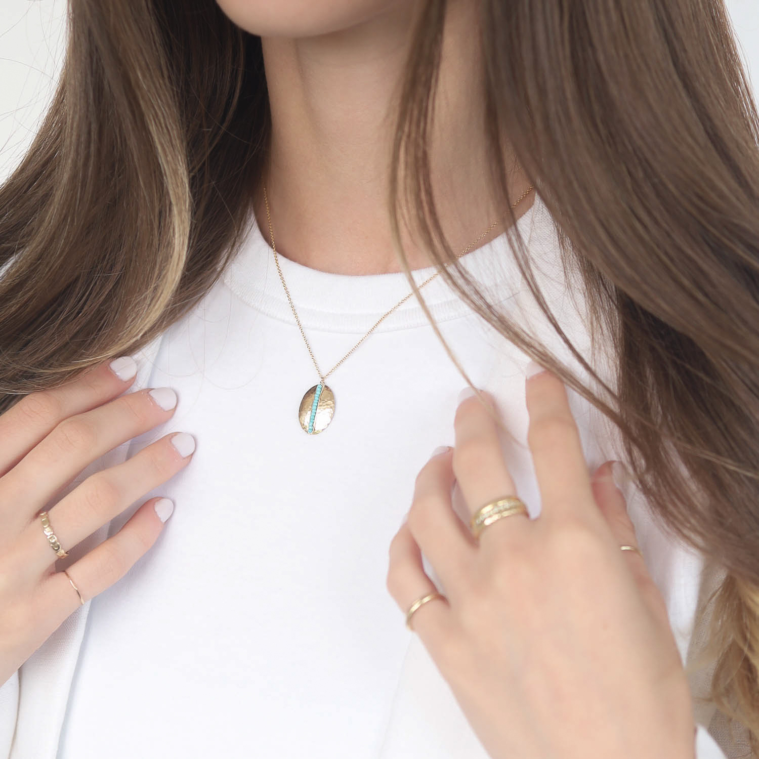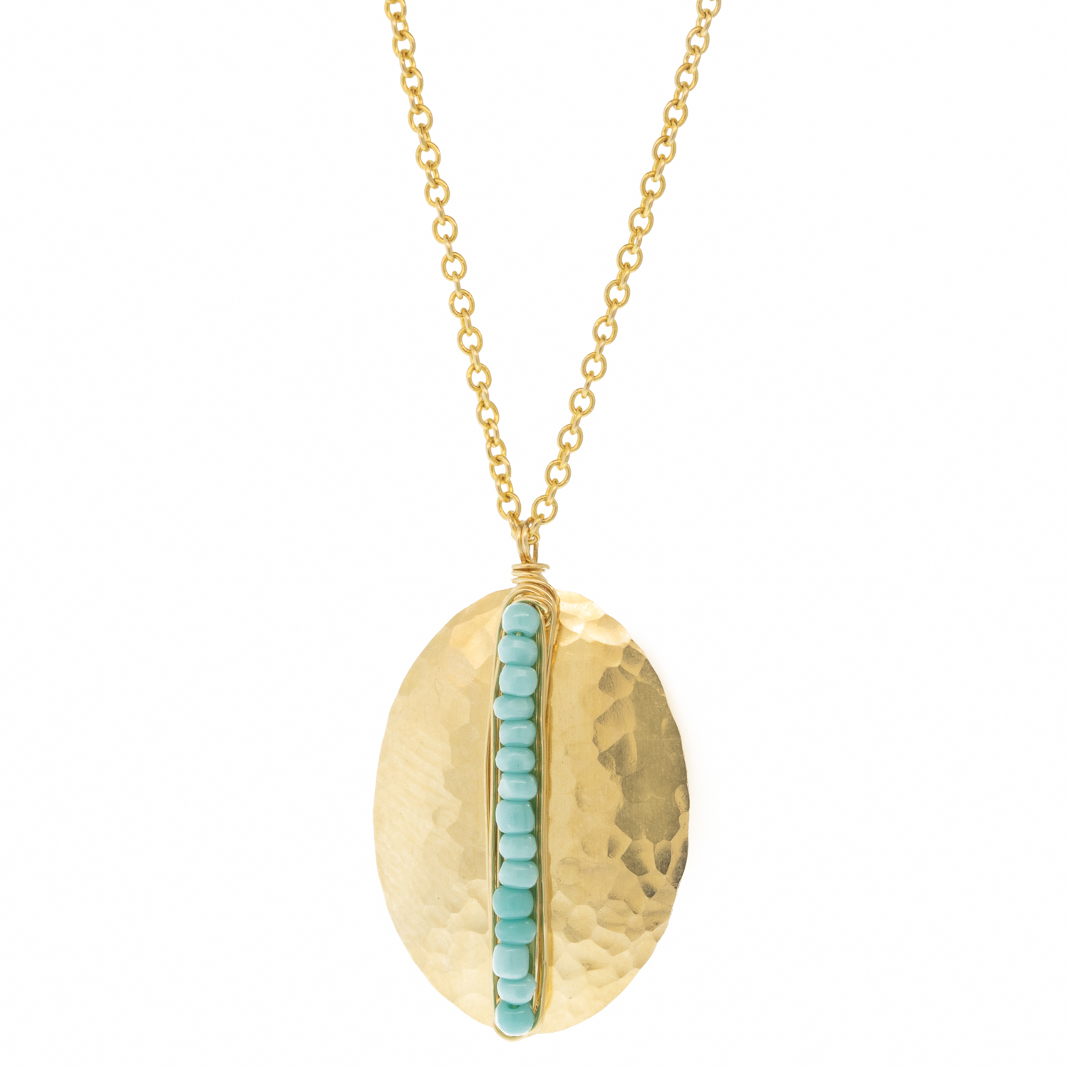 A dazzling display of vibrant turquoise beads are woven through the middle of this pendant.