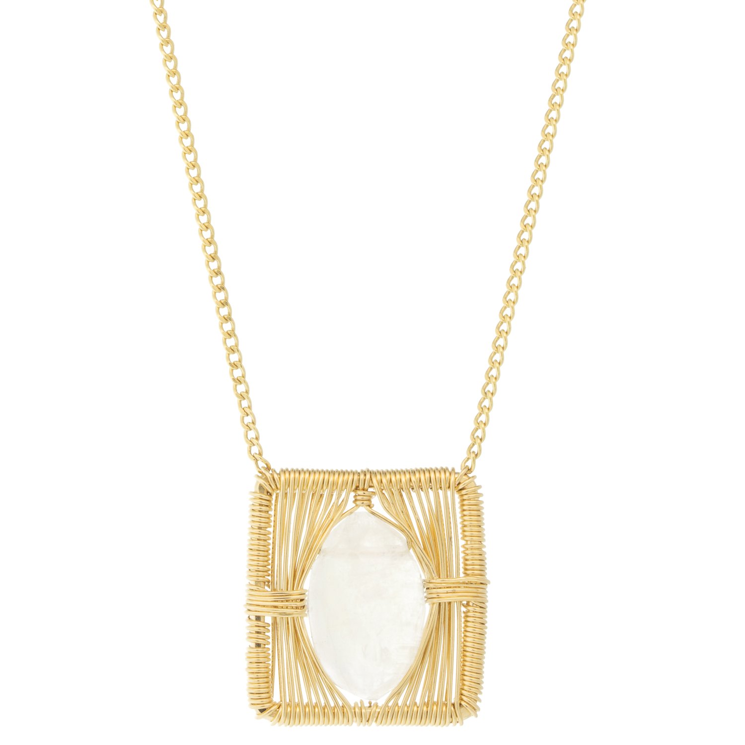 A dreamy moonstone appears to be peeking out from behind a curtain of gold in this stunning square pendant. Framed by Dana’s signature wire weaving technique, we cannot get enough of this necklace.