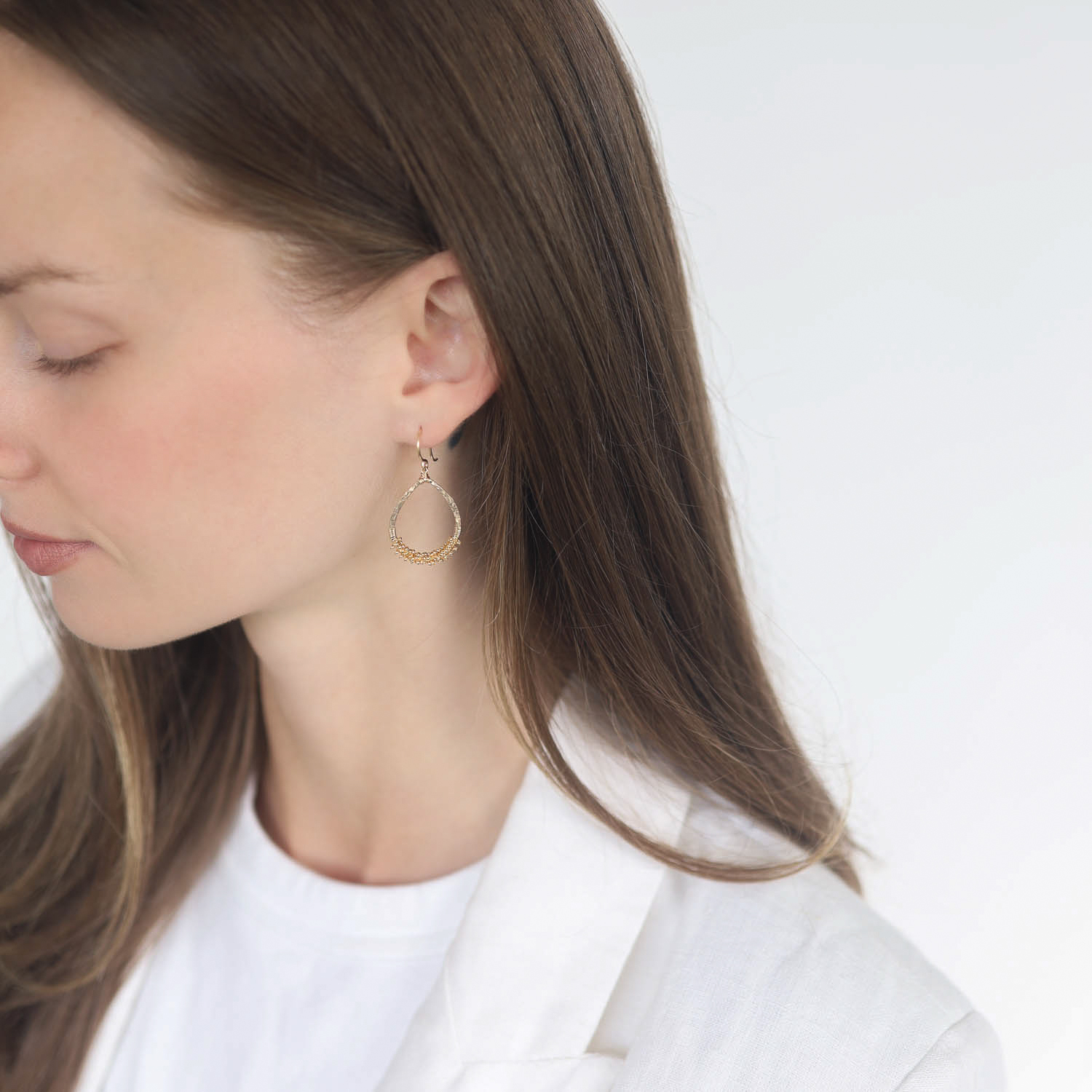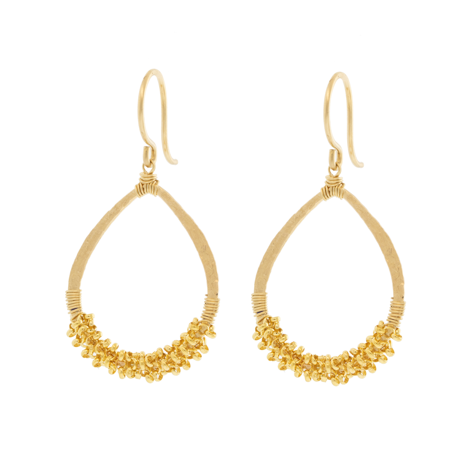 A teardrop shape is formed in textured gold, open in the center and lined by tiny beads to create a modern and chic vibe.