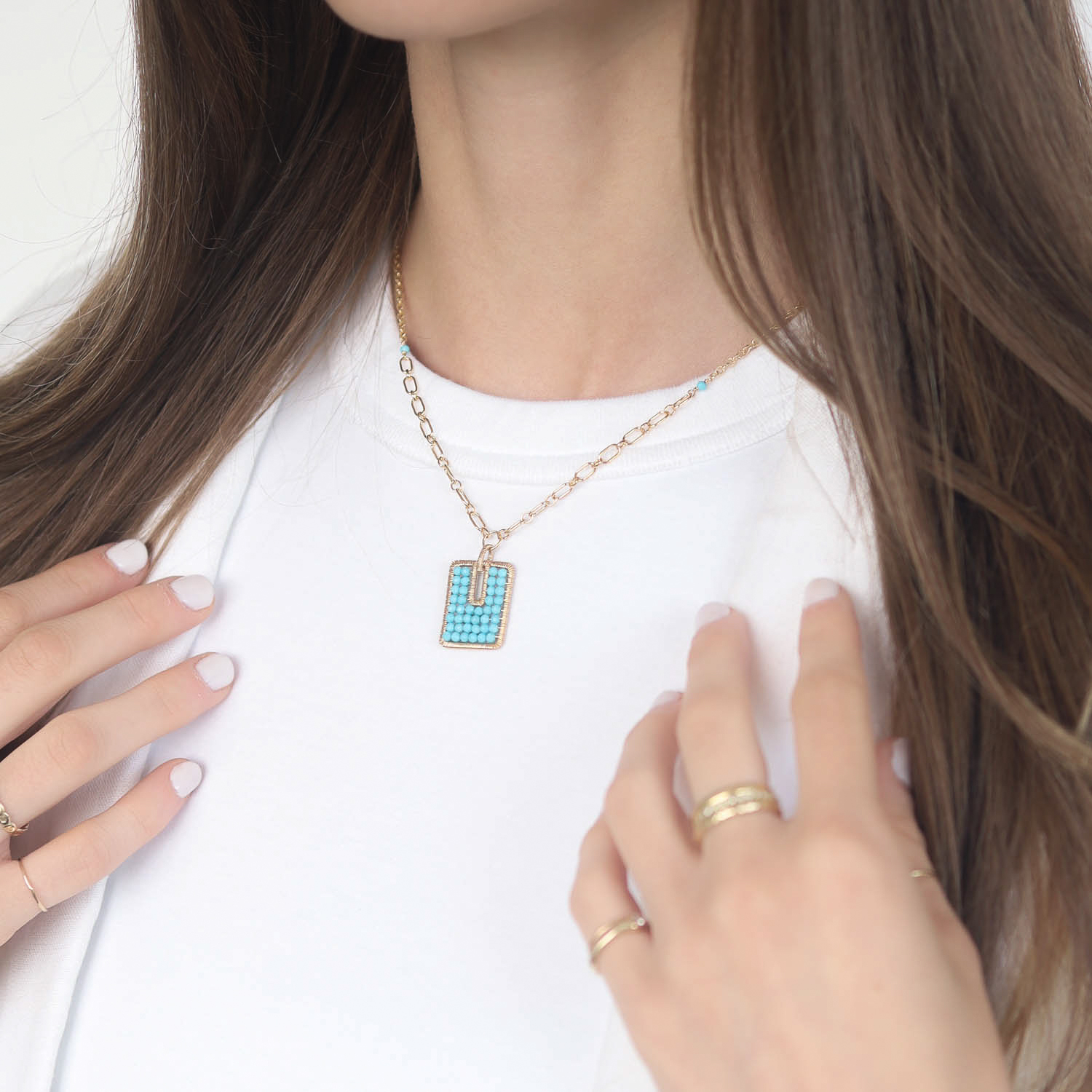 The perfect piece for turquoise lovers, this unique pendant features Dana’s signature gold-weaving technique.