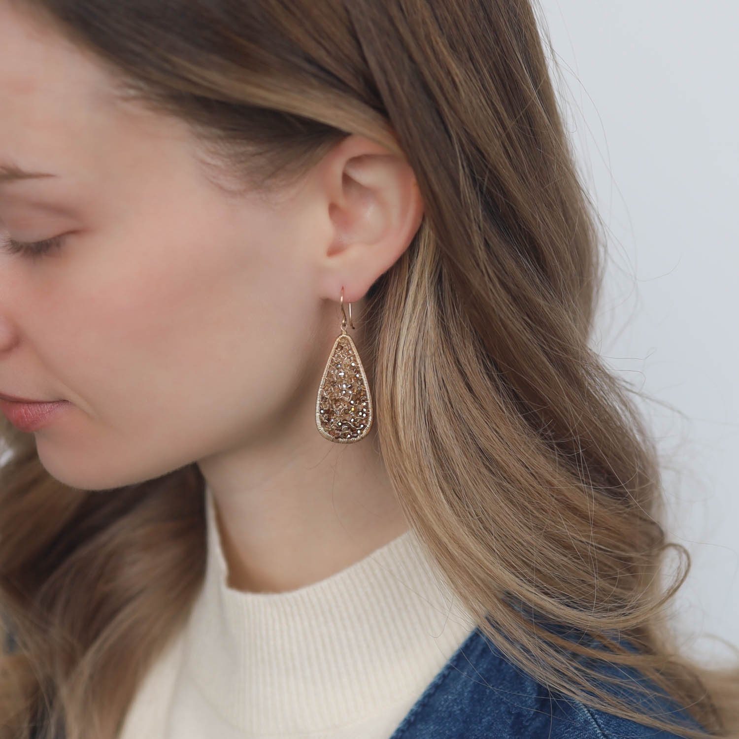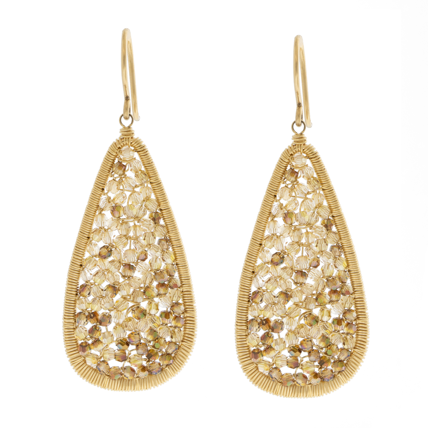 These earrings feature a mosaic of ombré sparkling crystals to catch all the light of the moon & stars and send sparkles scattered in every direction. Created using Dana’s signature gold-weaving technique, these earrings are as ethereal and lovely as they come. We especially love their long, universally-flattering design.