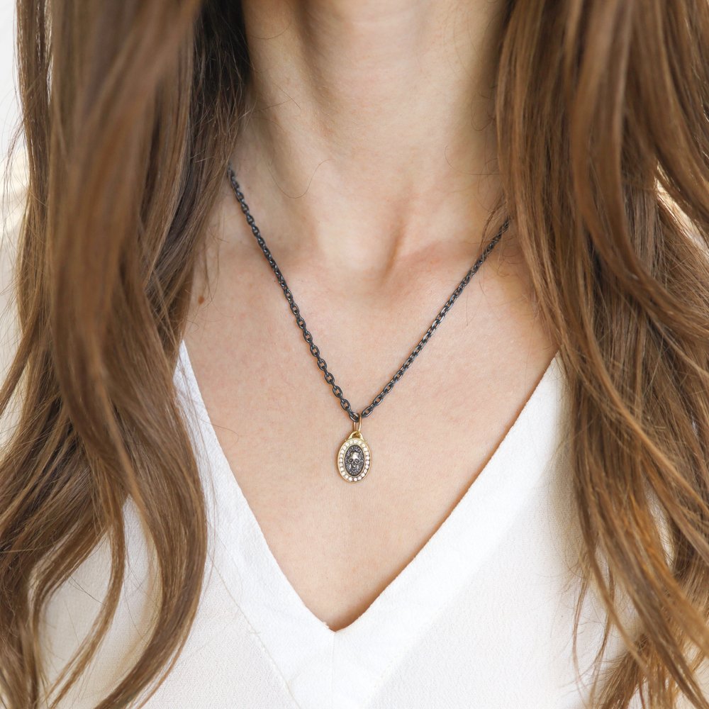 A diamond framed skull with ornate detailing. We love how easy it is to incorporate mixed metal into your current jewelry collection. This charm is brilliant on its own, or a solid base for layering Erica’s other charms to create a talisman that’s all your own.
