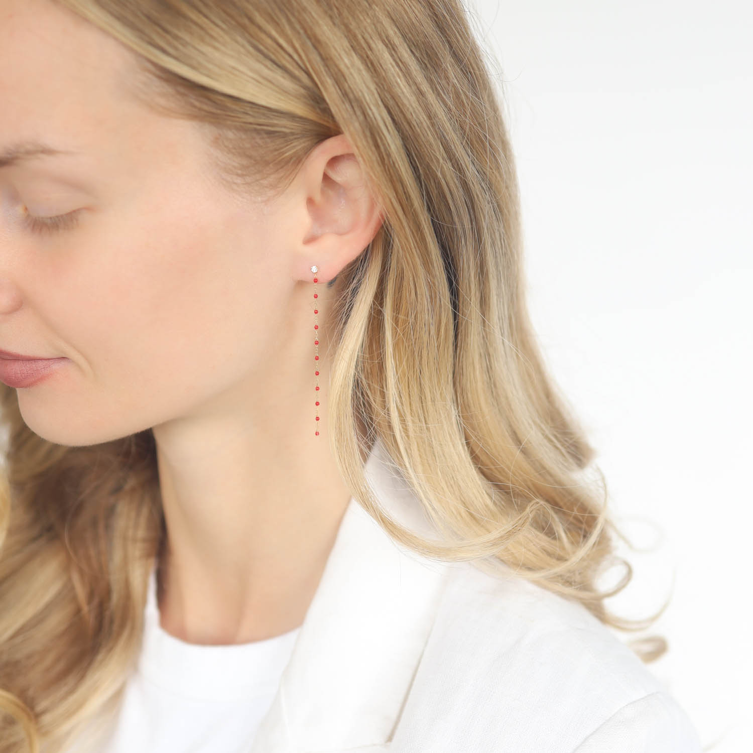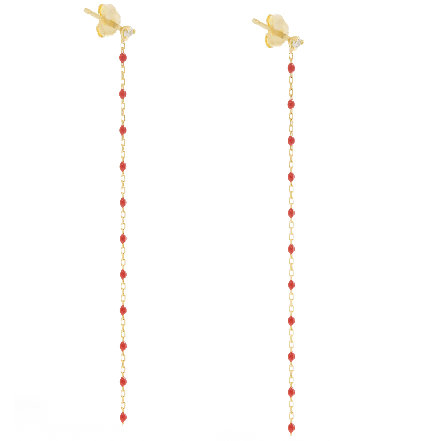 Vibrant, smooth resin beads lace with fine yellow gold, creating these dainty earrings full of movement and fit for everyday wear.