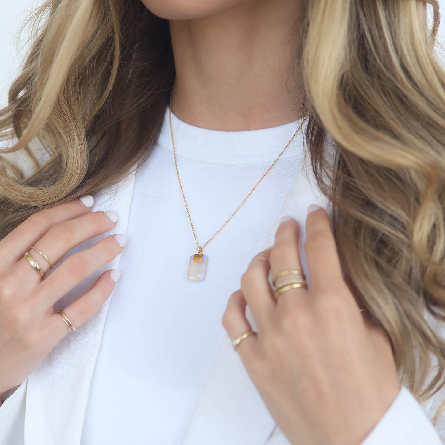 A mystifying opal is enhanced by a luminous golden bail, accented by a single diamond bezel.