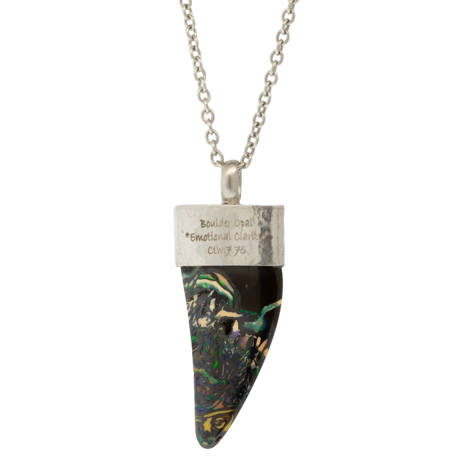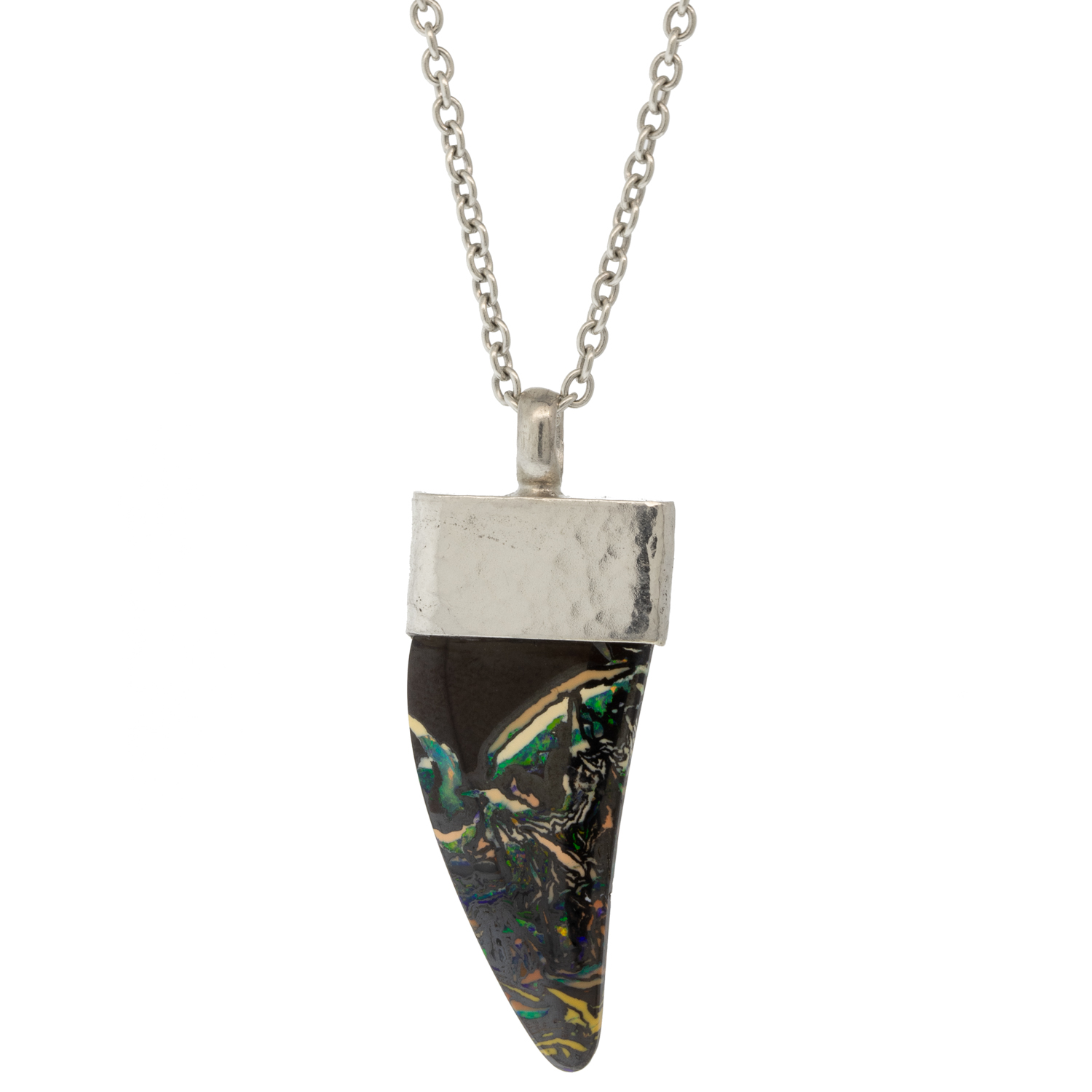 This stunning boulder opal, thought to bring emotional clarity, holds a sparkling rainbow within, shaped similarly to a shark’s tooth.