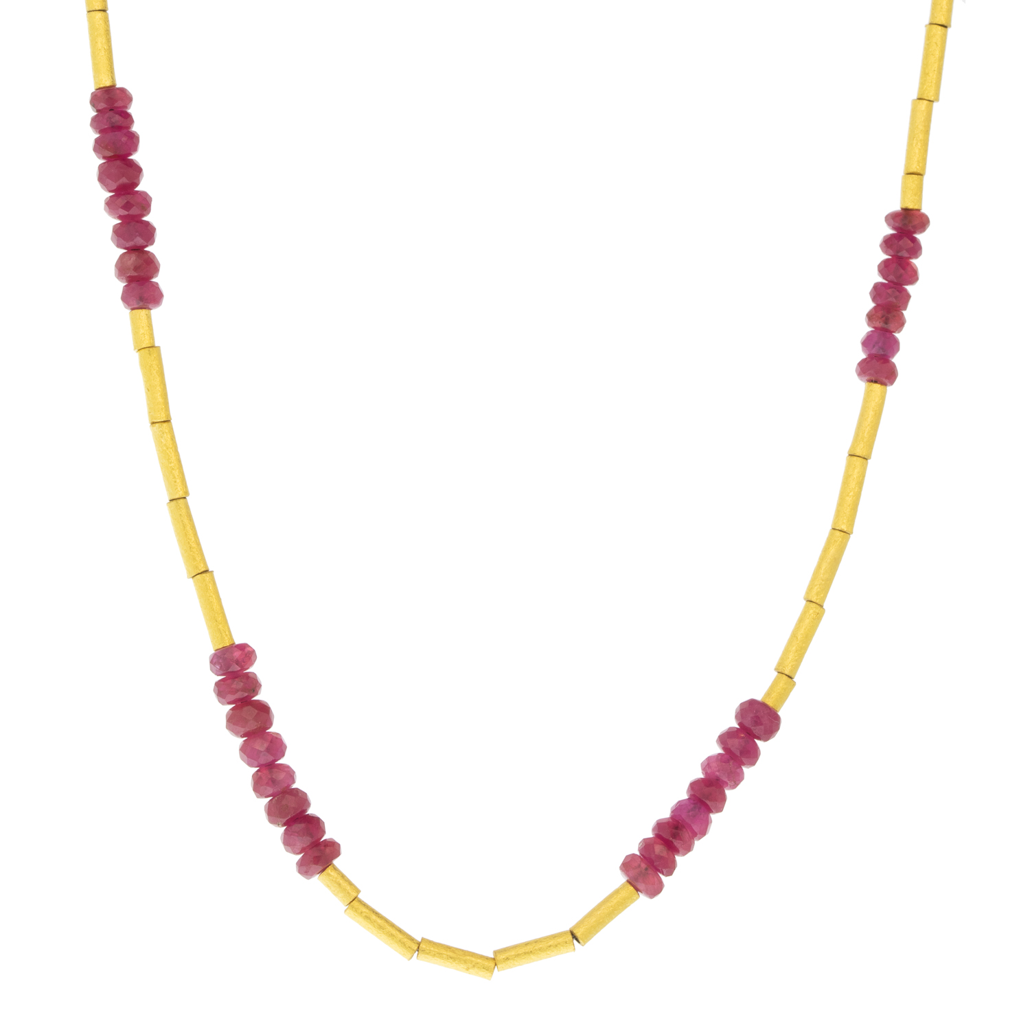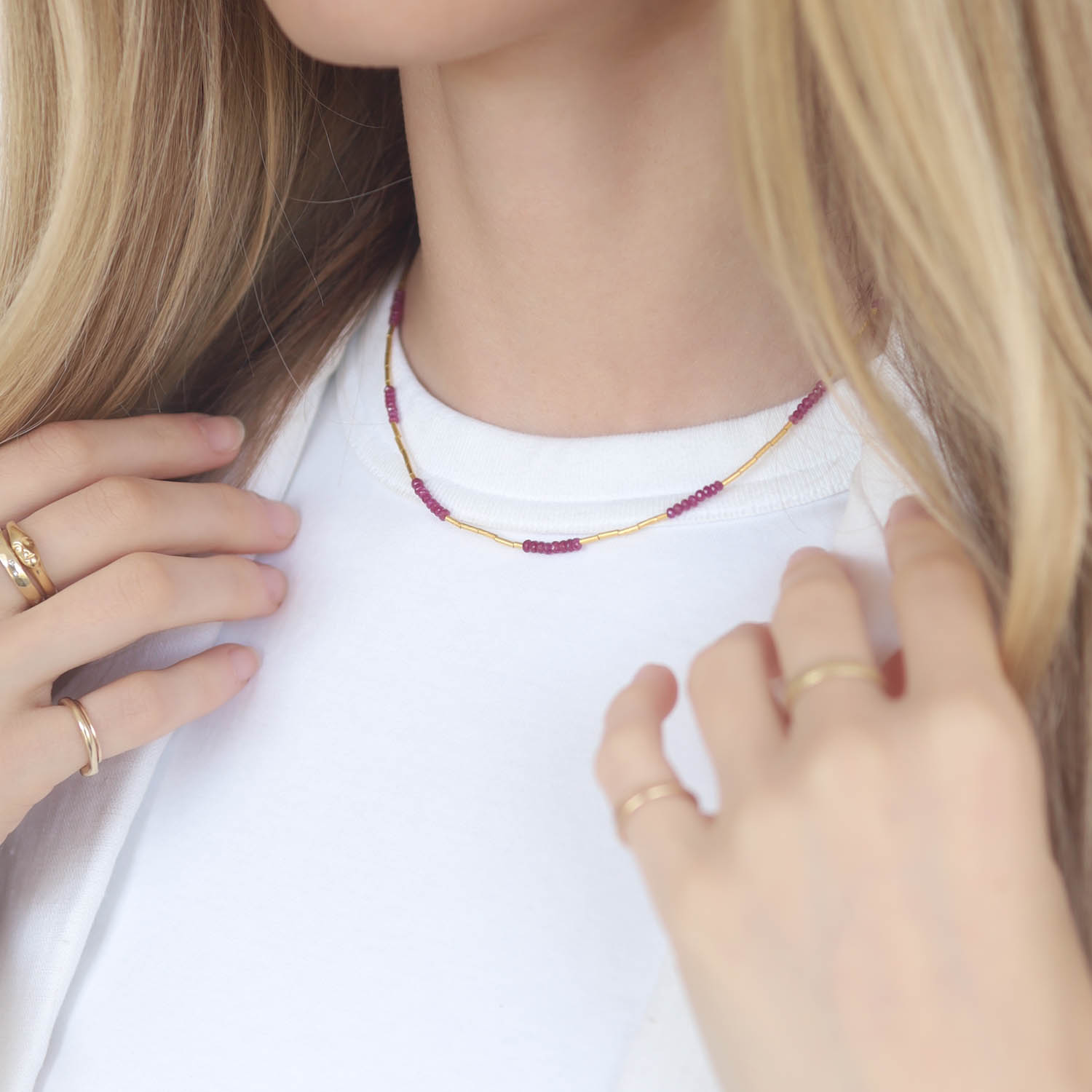 Complete with a stardust-like matte shine and vibrant rubies, this gold necklace is a bold addition to your layers.
