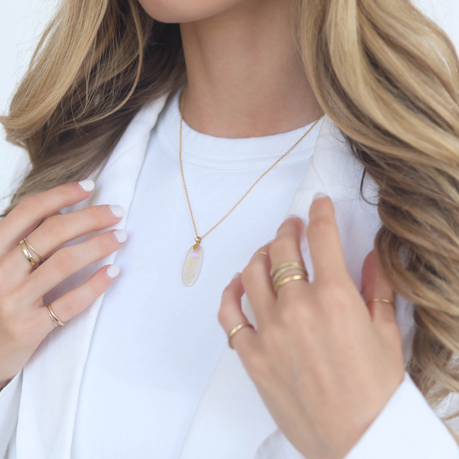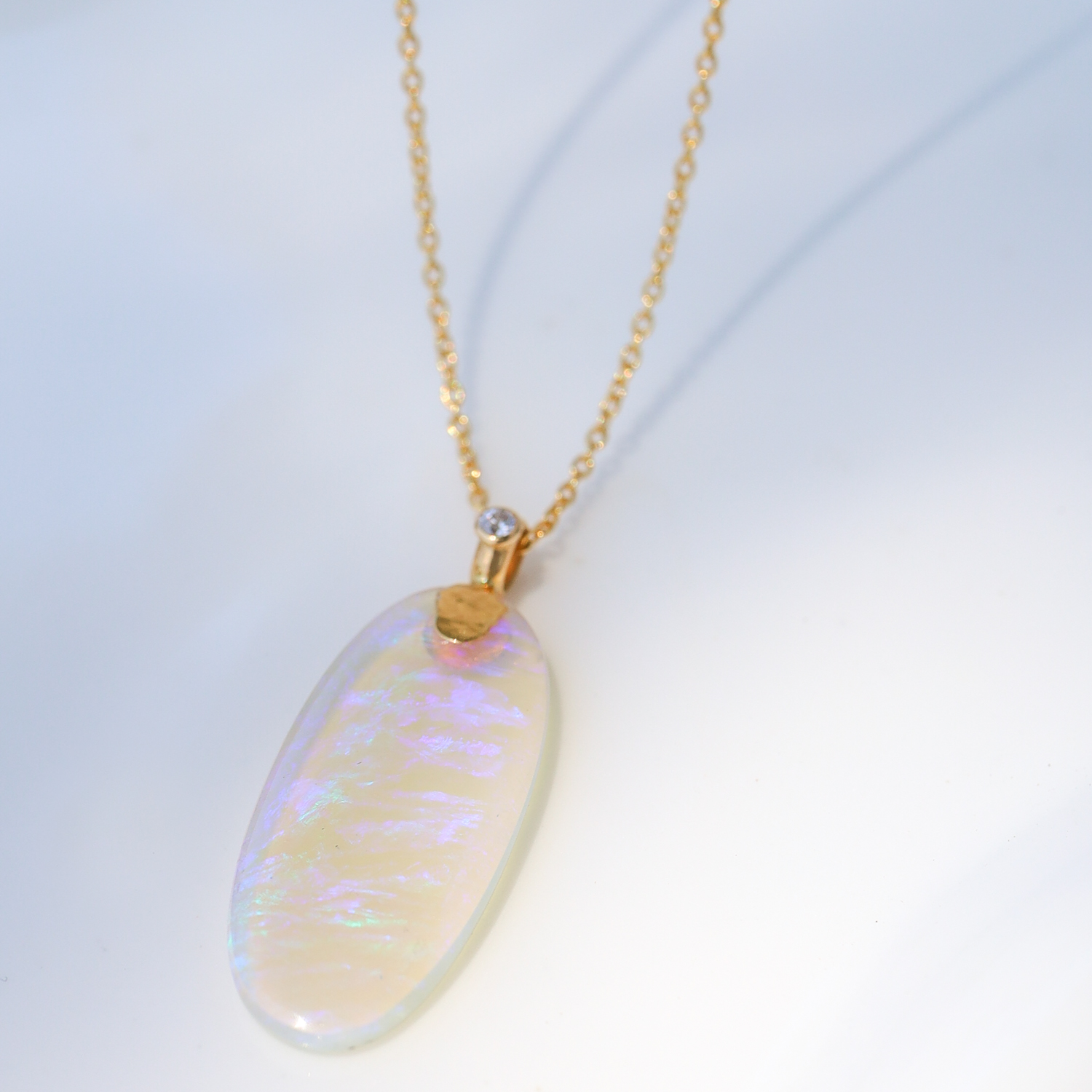 A mystifying opal is enhanced by a luminous golden bail, accented by a single diamond bezel.