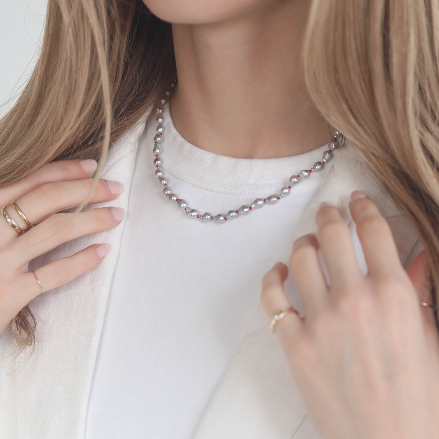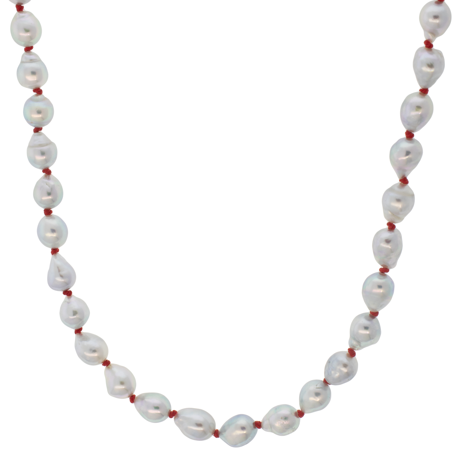 A gorgeous string of pearls is beautifully enhanced with pops of coral knotted silk.