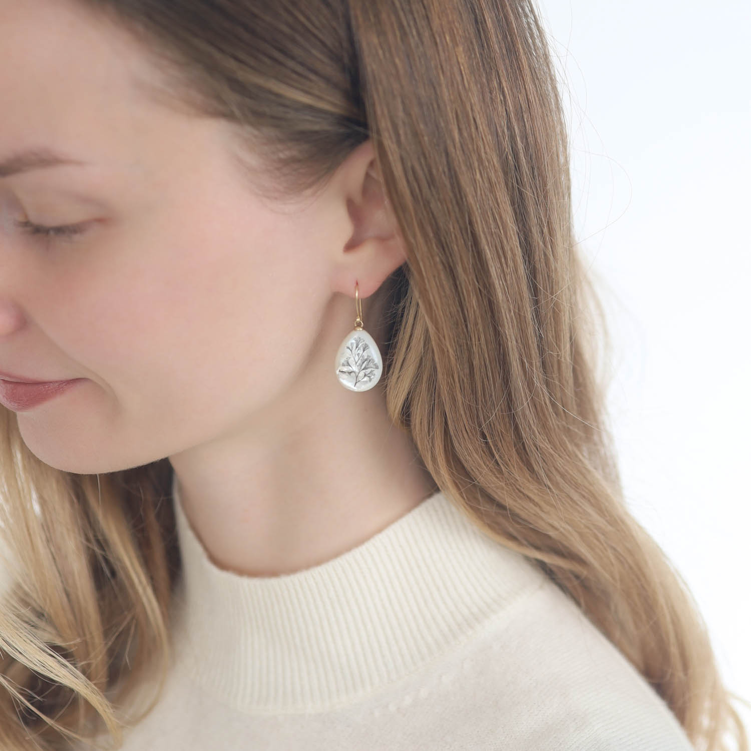 An homage to ocean flora; shimmering drops of mother of pearl are ingrained with hand-scribed scrimshaw wisps of seaweed. These earrings are reminiscent of glimmering tide pools and all of the wonder and beauty within their peculiar worlds.