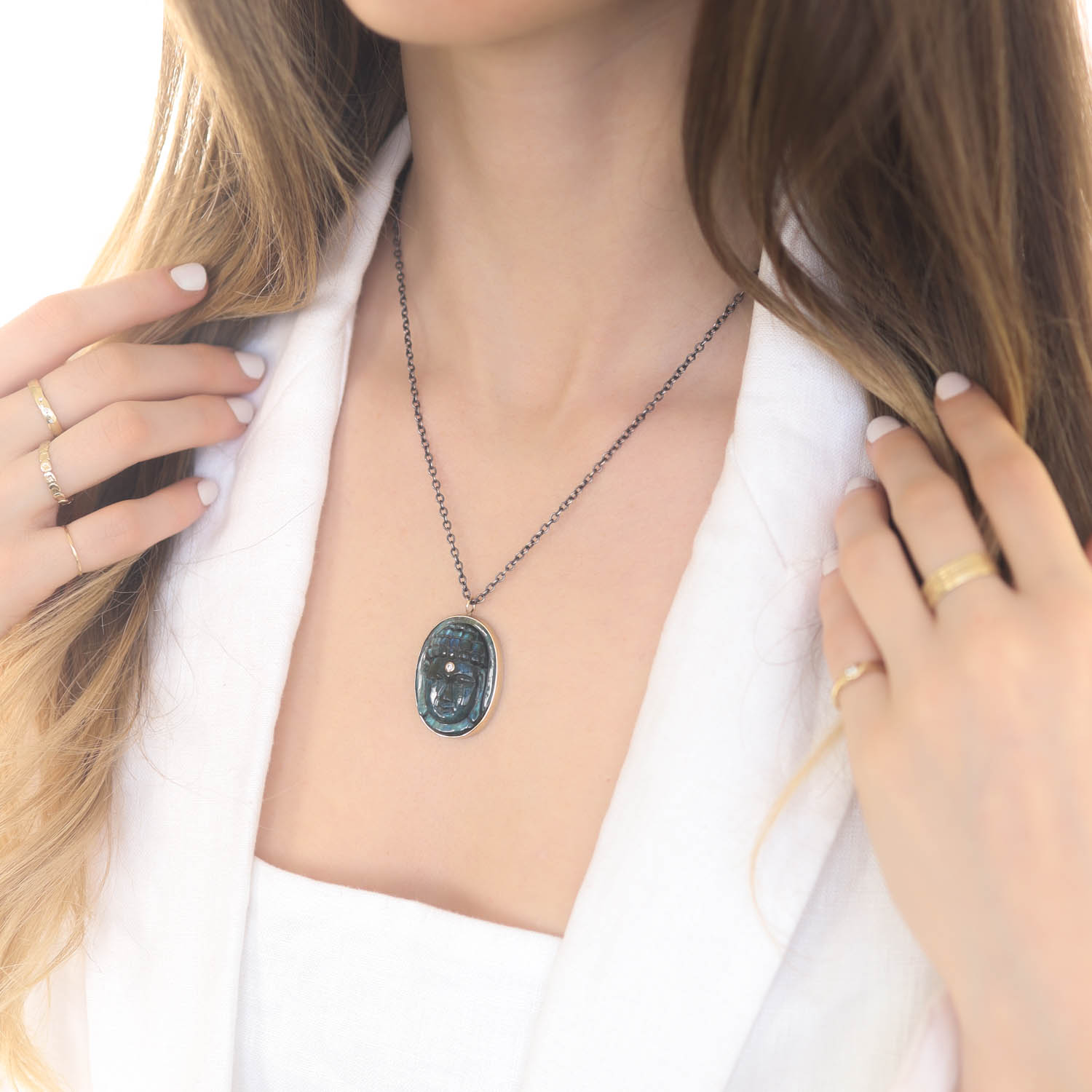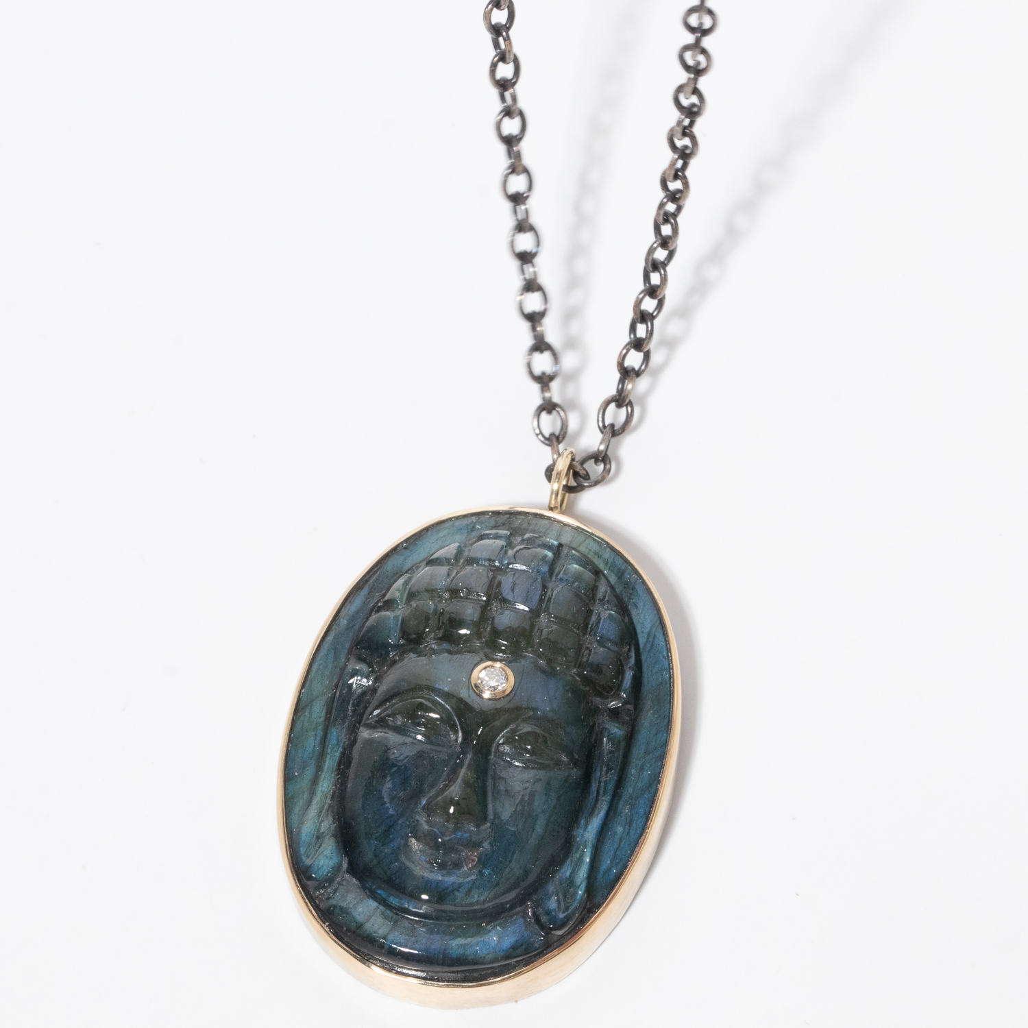 This Buddha is carved in labradorite, a stone said to help channel positive change and inner strength by eliminating negative energy.