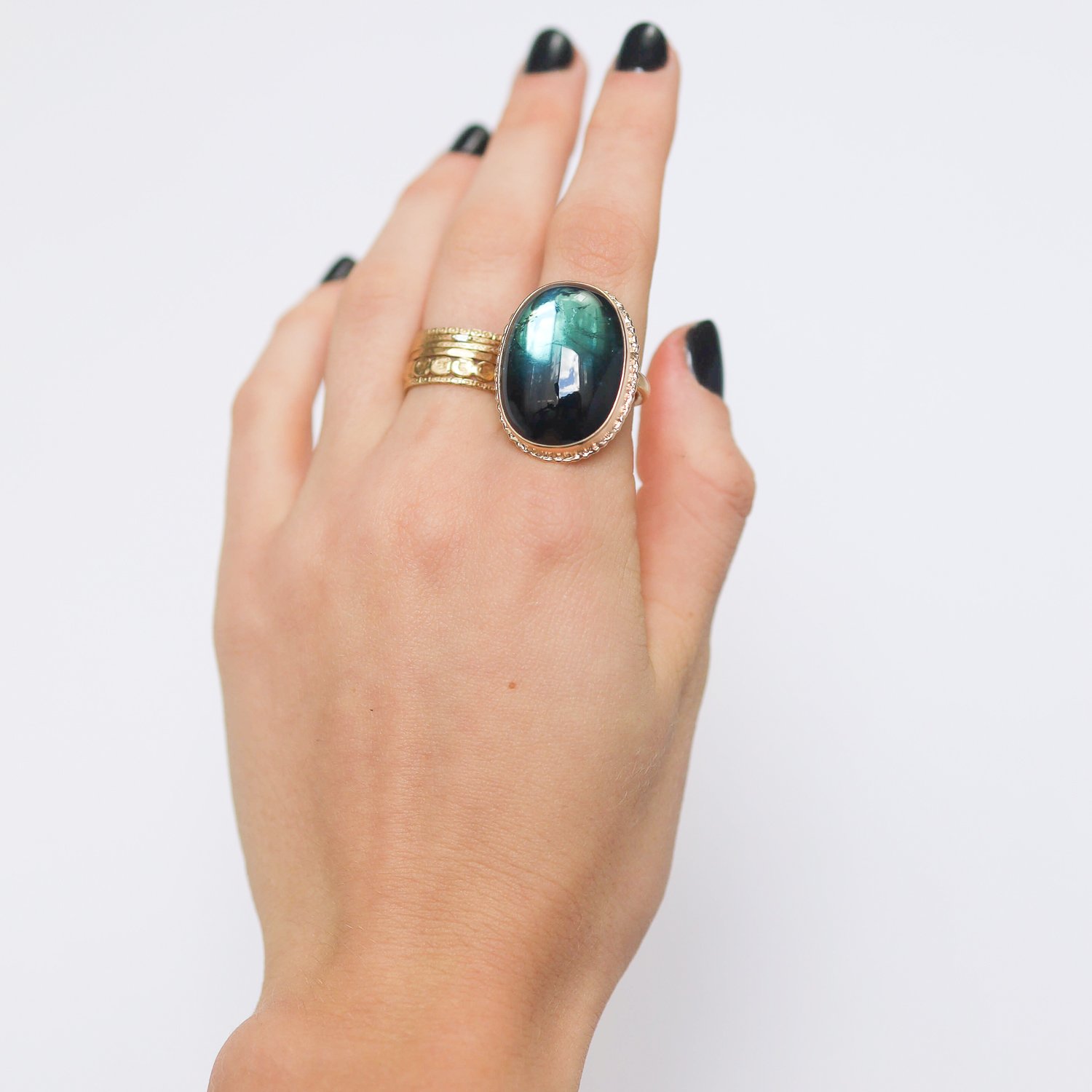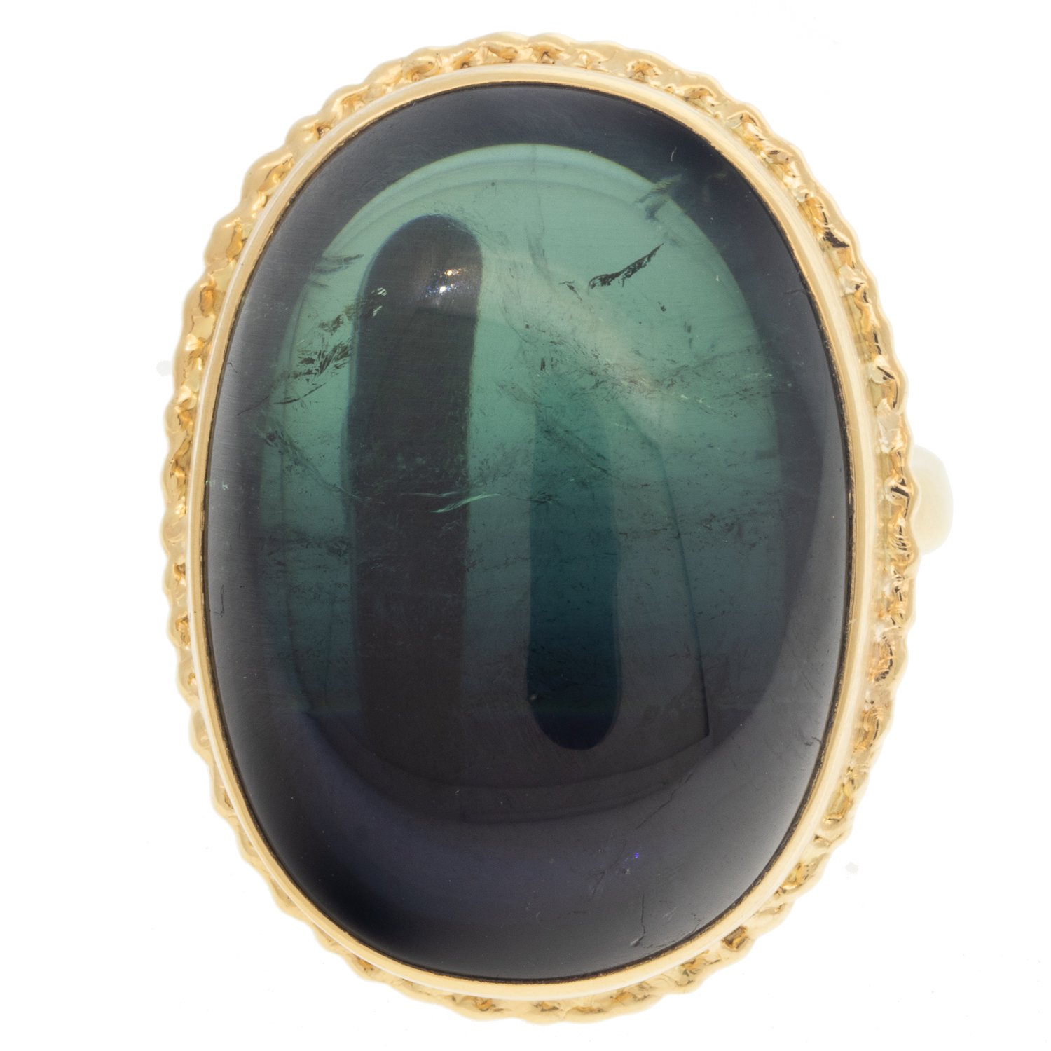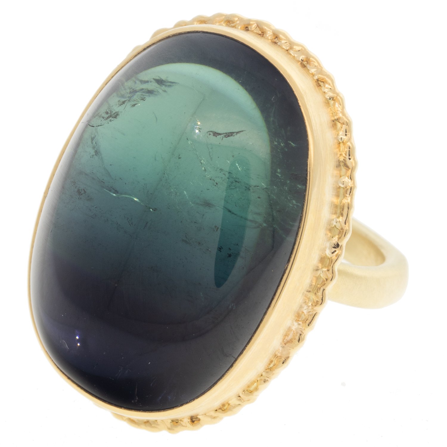 - 14K gold bezel set blue green tourmaline on ruffled platform