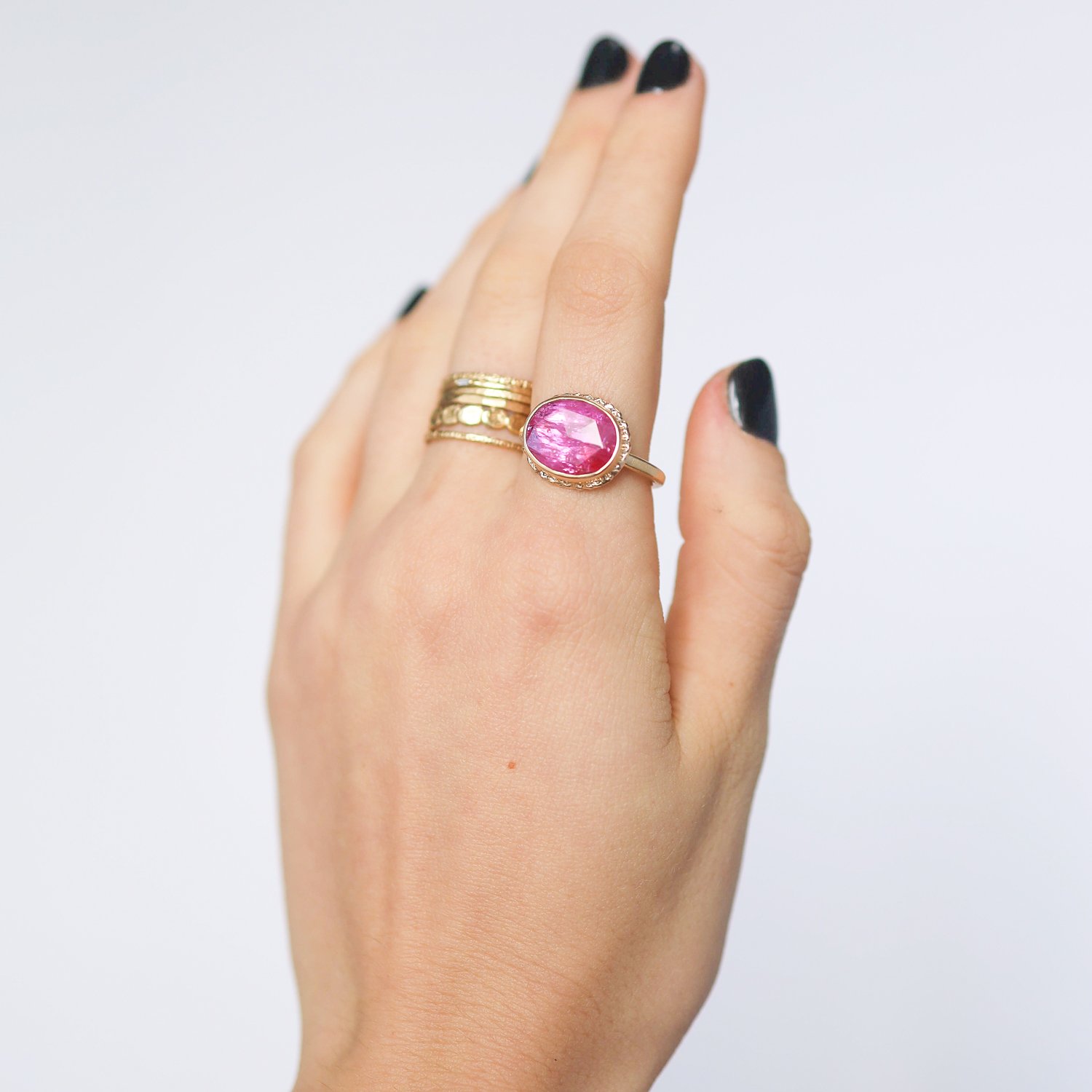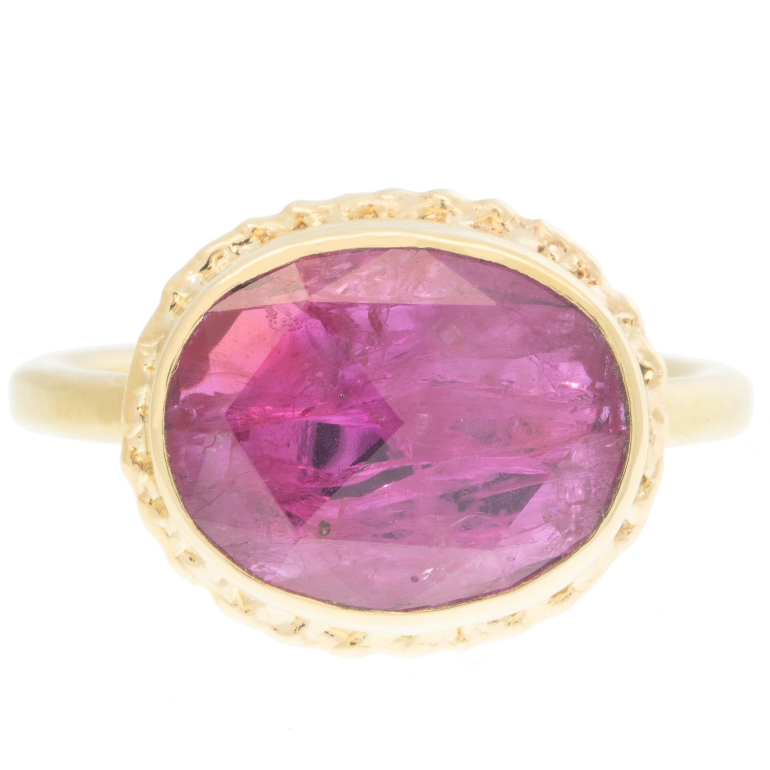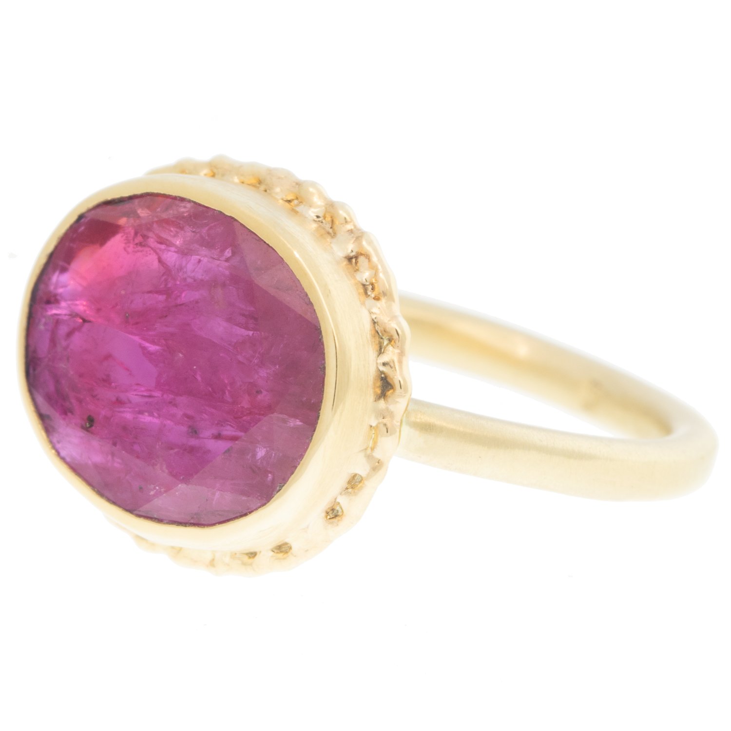 - 14K gold bezel set Mozambique ruby on ruffled platform
