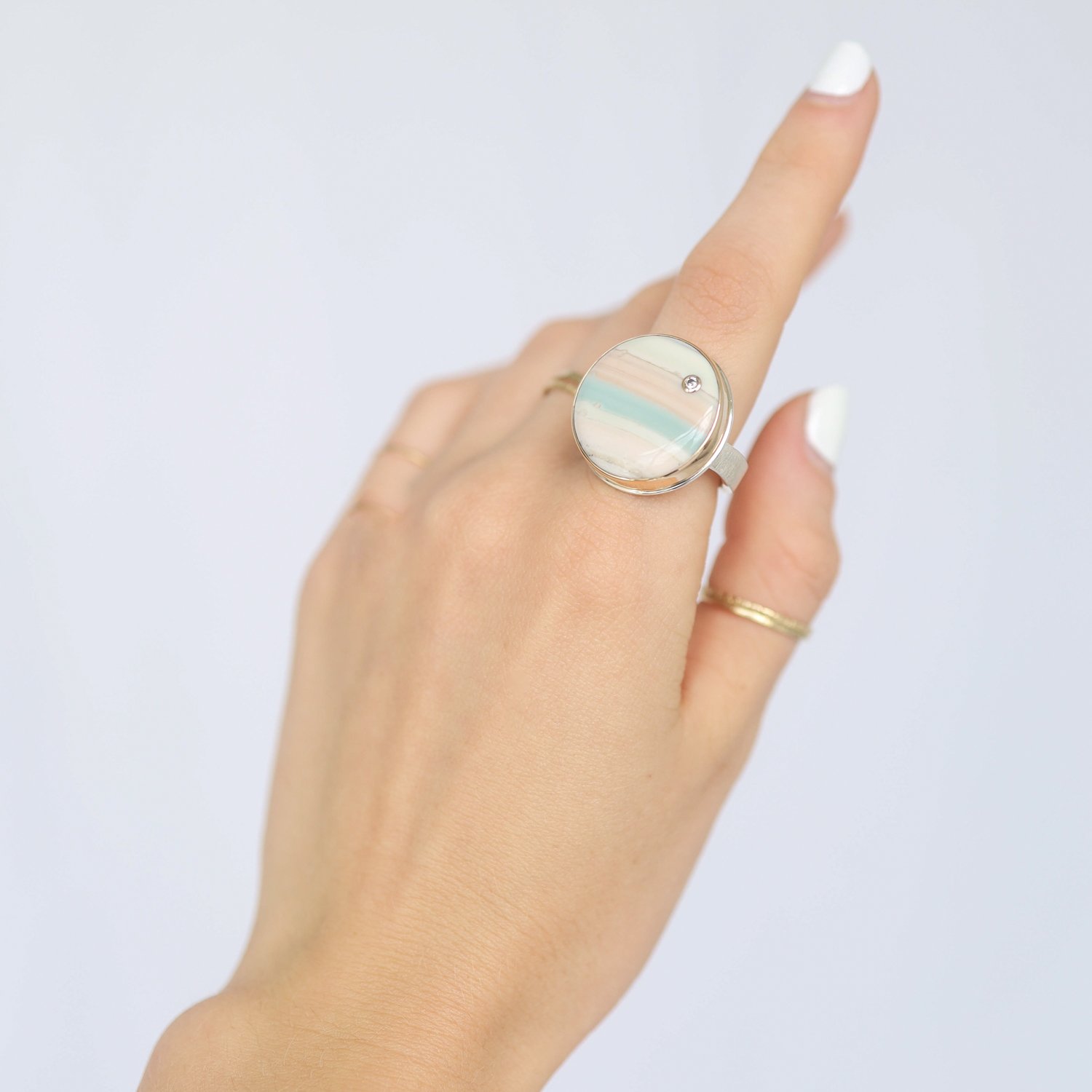 The Saturn chalcedony is like a work-of-art. With beautiful currents of blue, taupe and gray. A stunning ring thought to bring balance to its wearer.