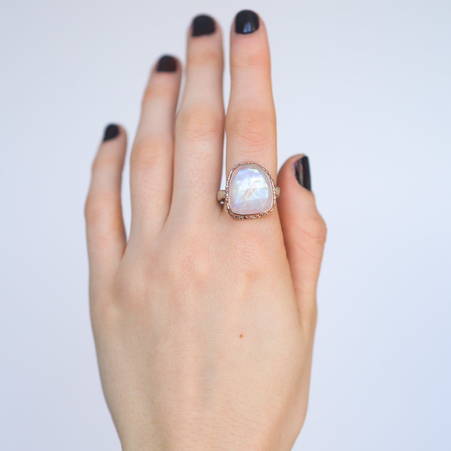 Rose Cut White Rainbow Moonstone Ring