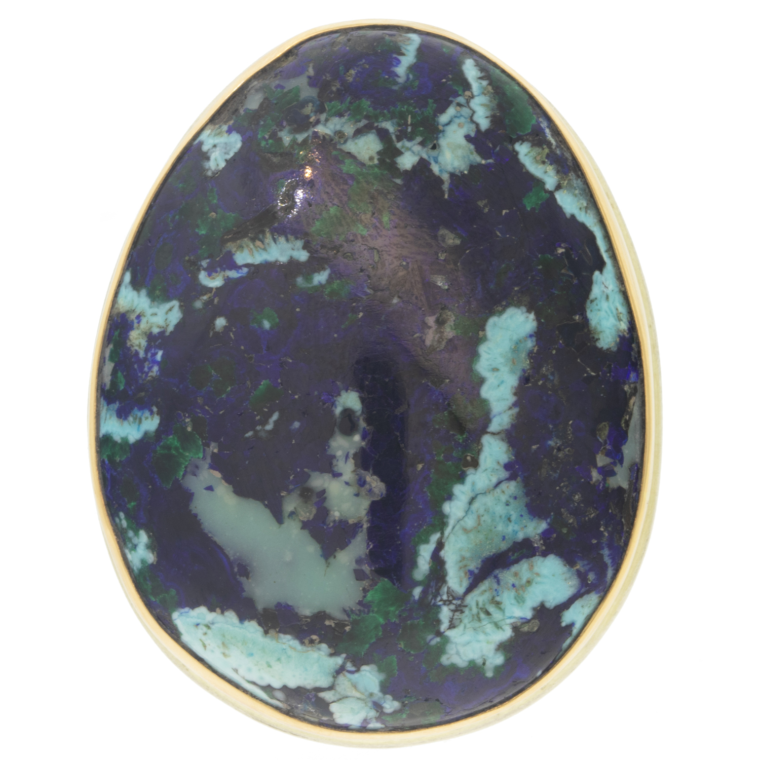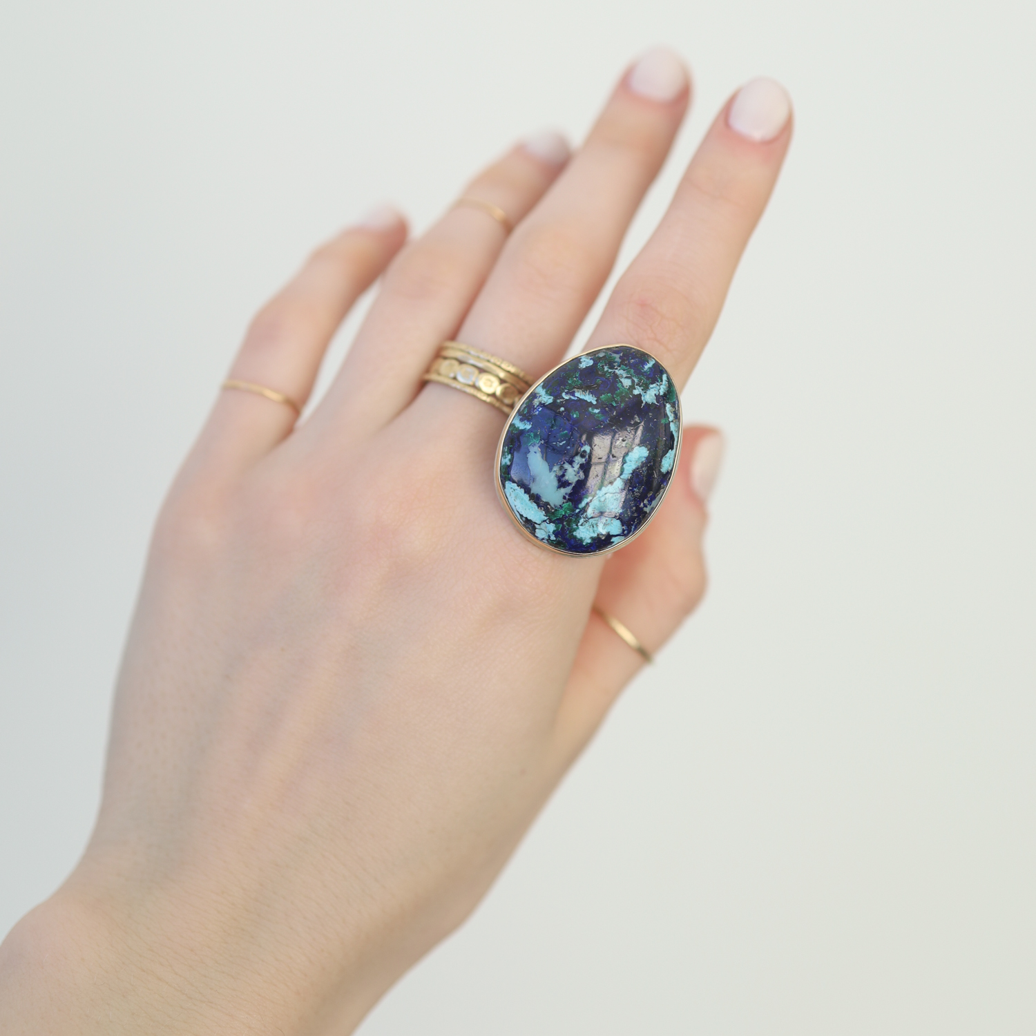 The naturally formed combination of azurite, chrysocolla, and malachite is a stone trifecta that some believe help its wearer navigate through times of change.