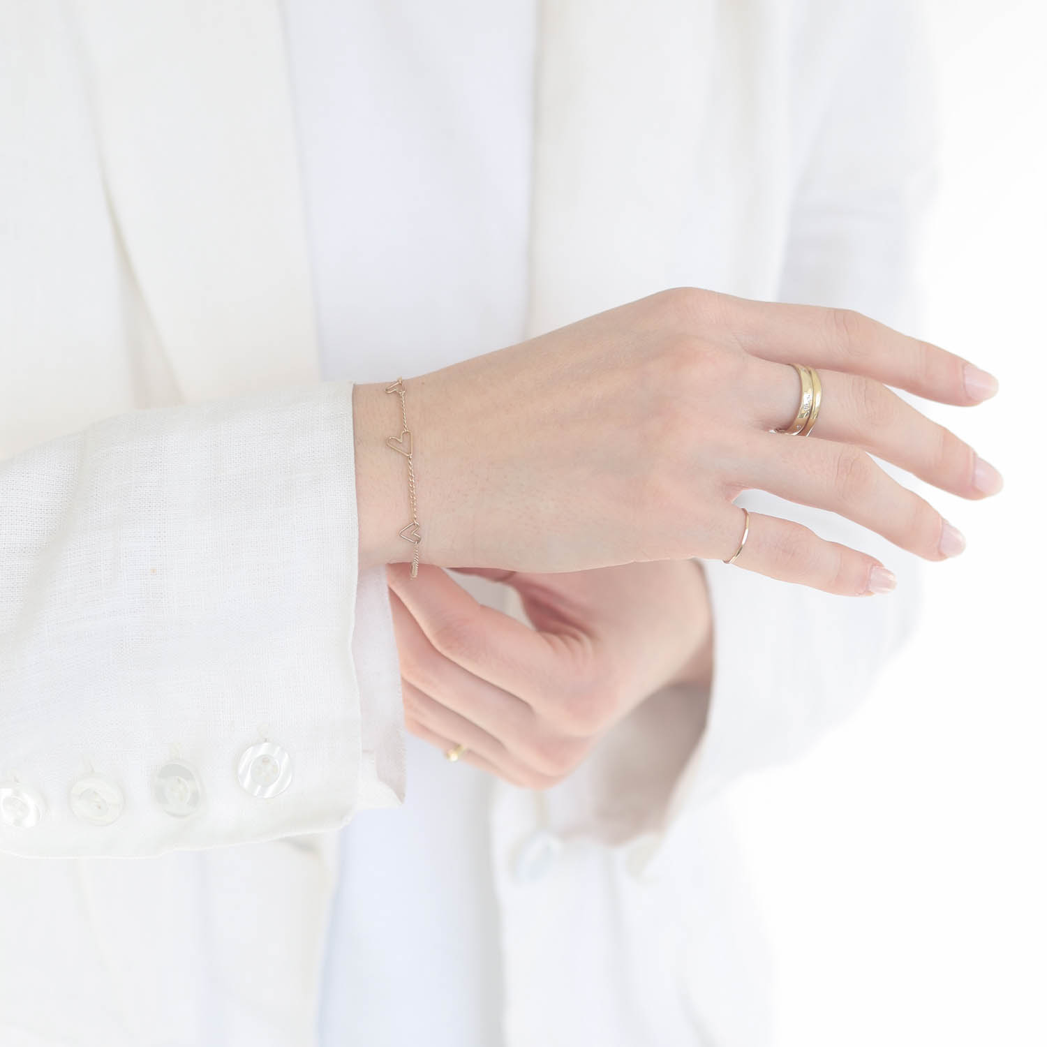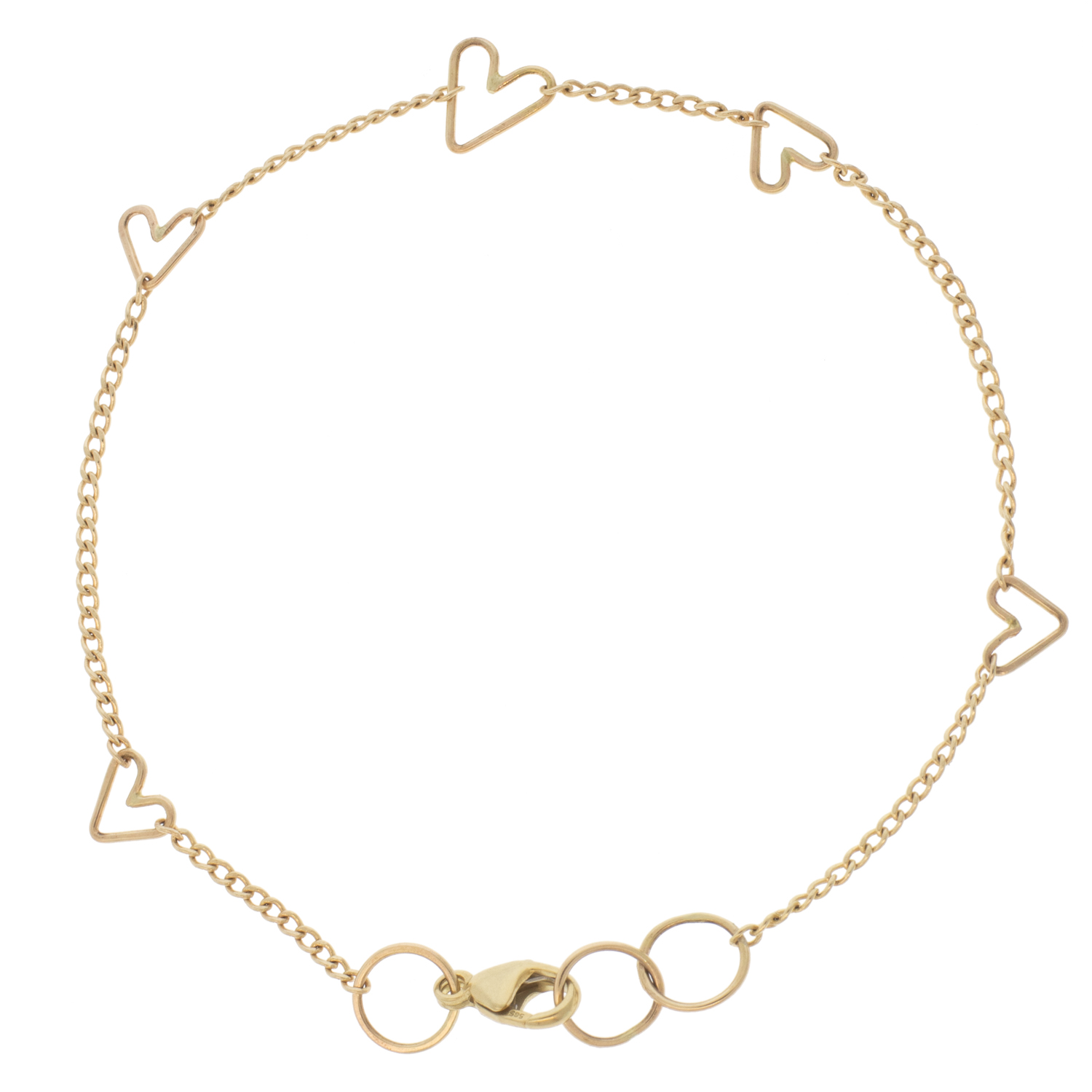 This bracelet, with its five hearts of gold, is the perfect addition to your favorite layers. We love the way the hearts move and twirl on their golden chain.