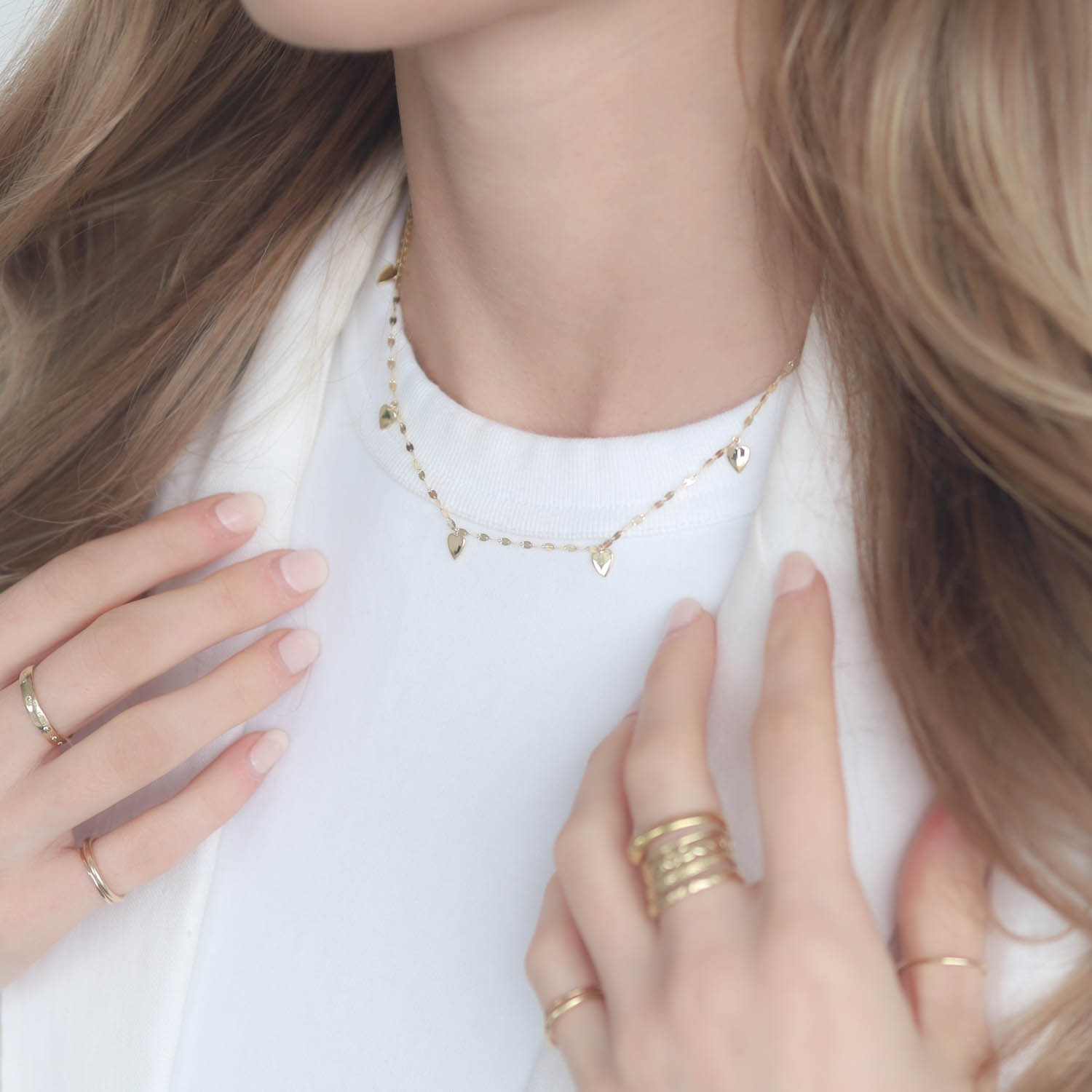 This lithe chain falls below the neck like pure liquid luxury. It’s unique design holds strength in versatility, layering beautifully with anything.
