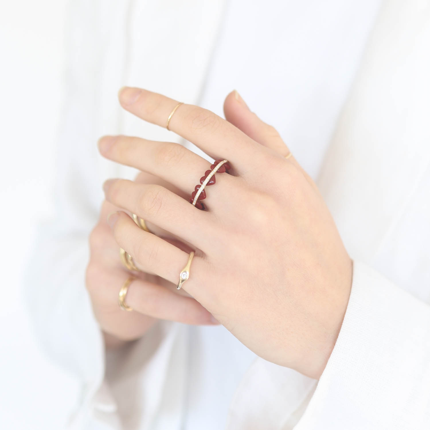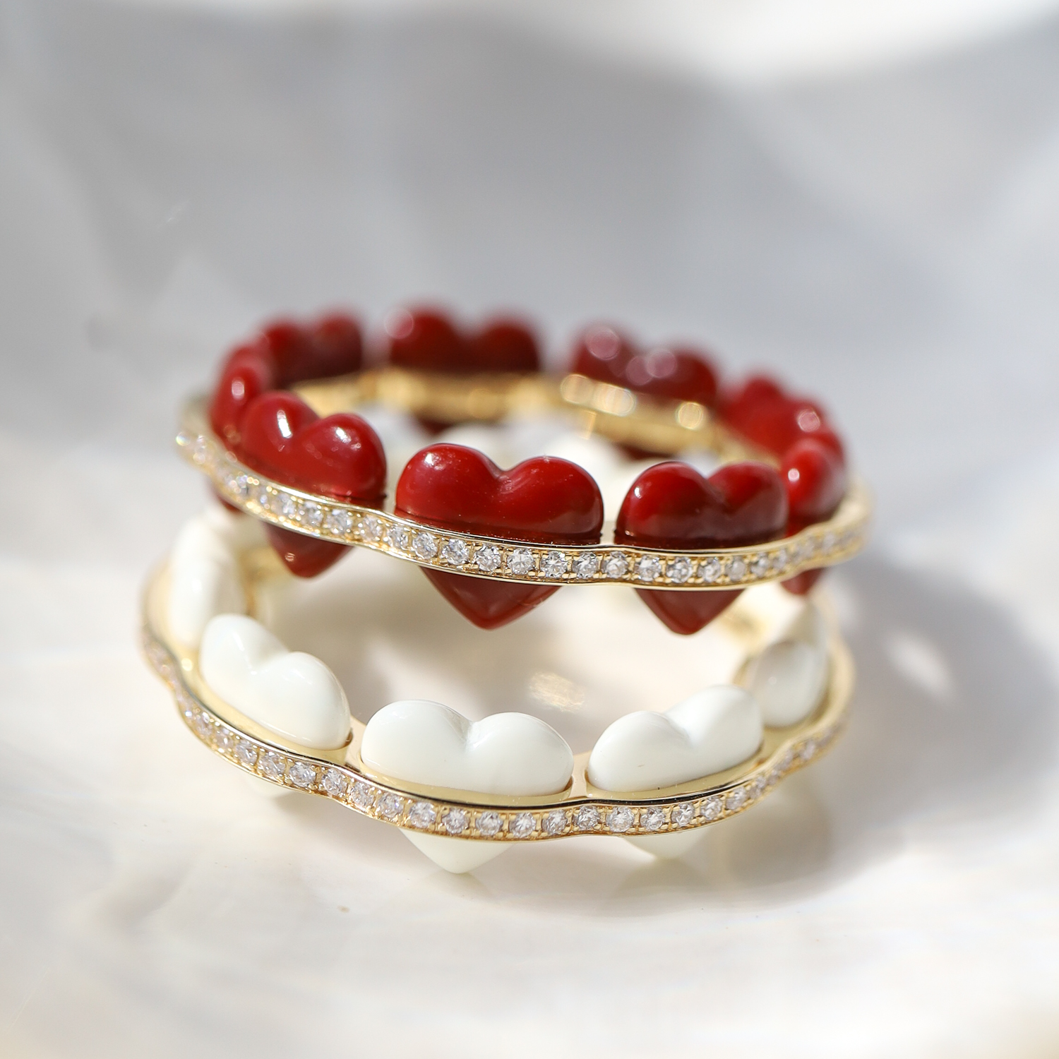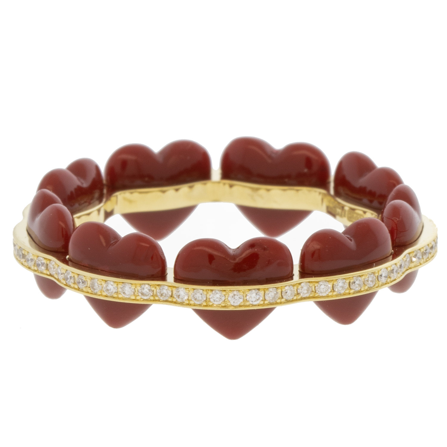 This band is inspired by the unique building blocks of all things—atoms. Vibrant burgundy hearts are are bound together through a gold, diamond-lined band, much like atoms form bonds to create beautiful life on earth.