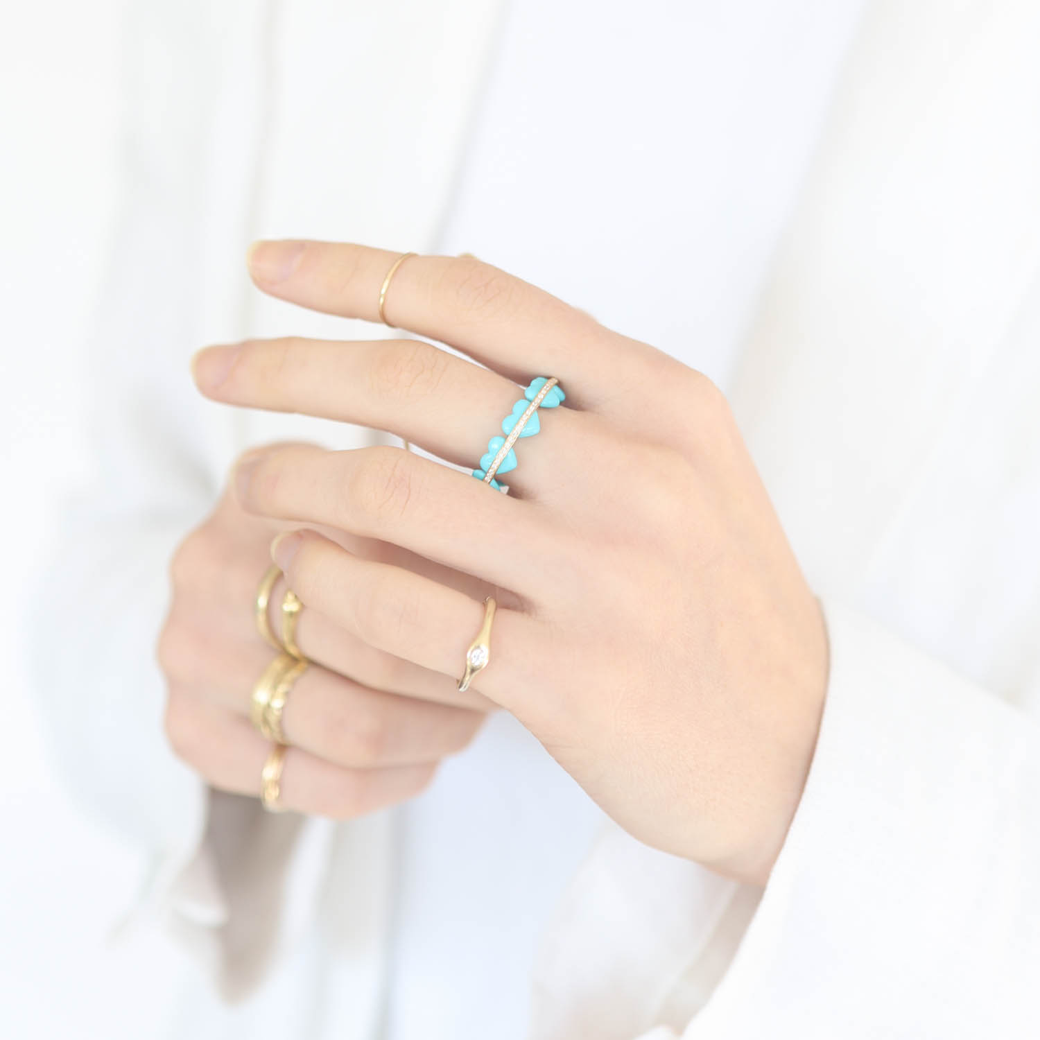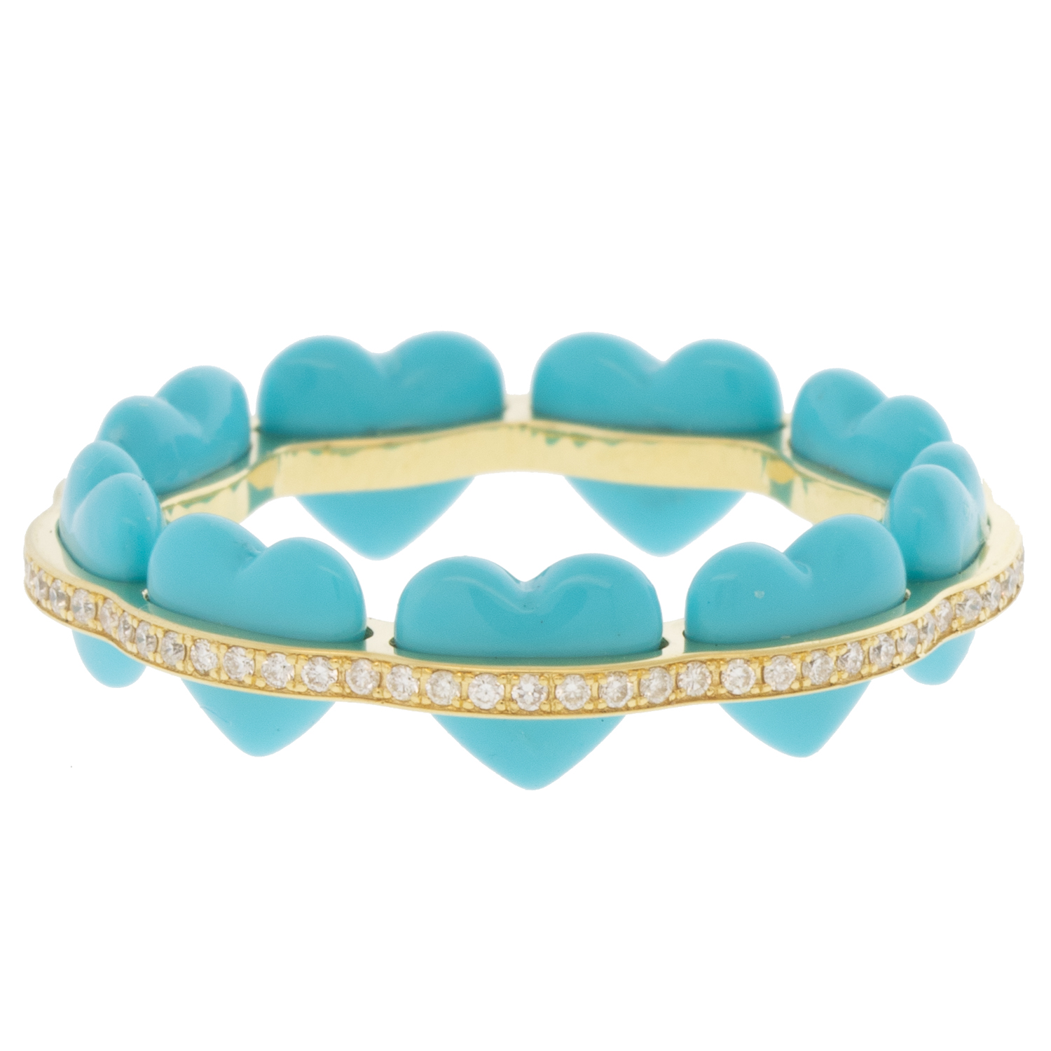 This band is inspired by the unique building blocks of all things—atoms. Vibrant turquoise hearts are are bound together through a gold, diamond-lined band, much like atoms form bonds to create beautiful life on earth.