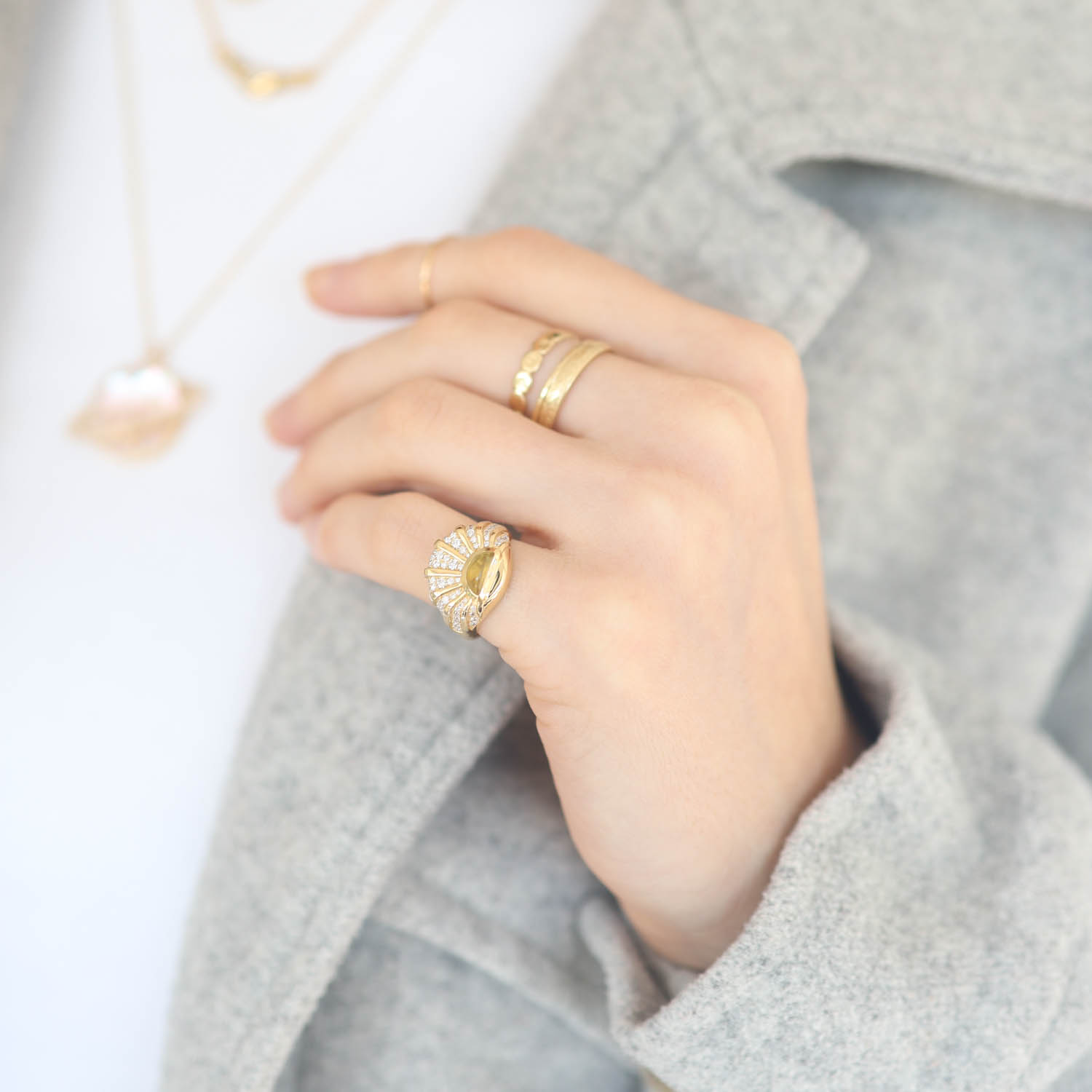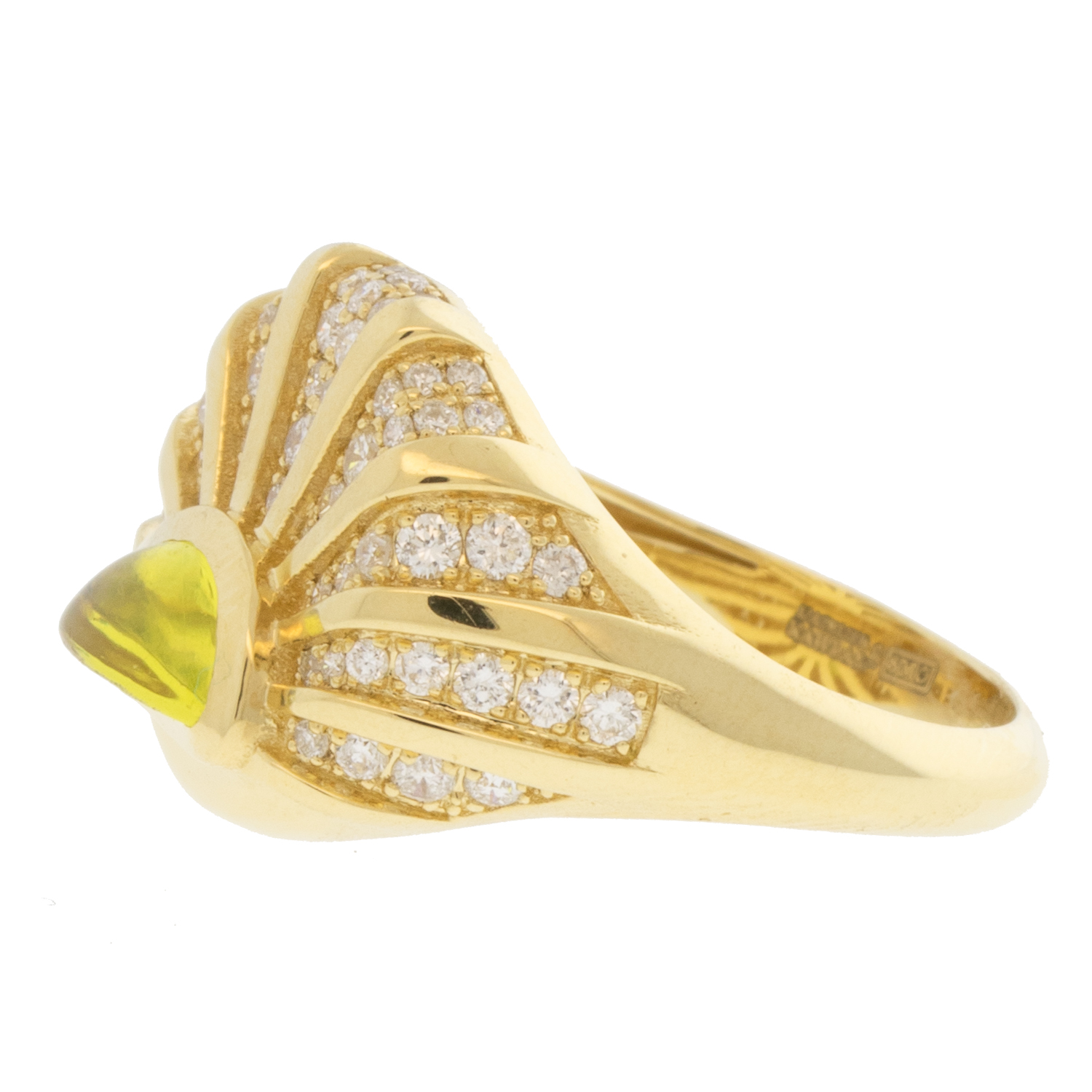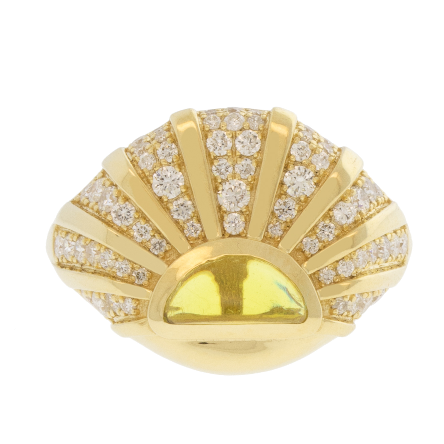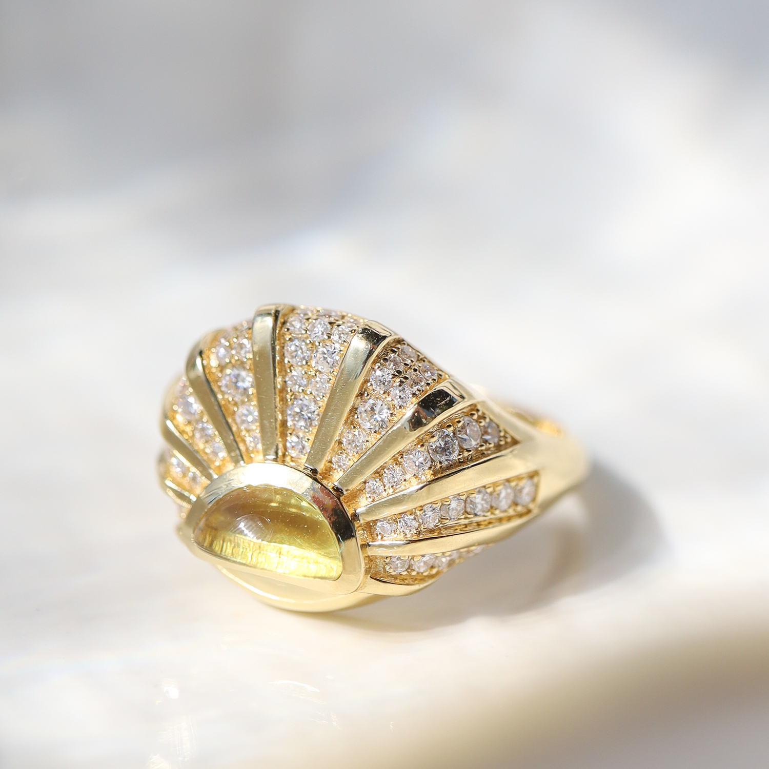 This version of L’atelier’s warrior design features golden rays and twinkling diamonds radiating from a vibrant citrine rising sun.