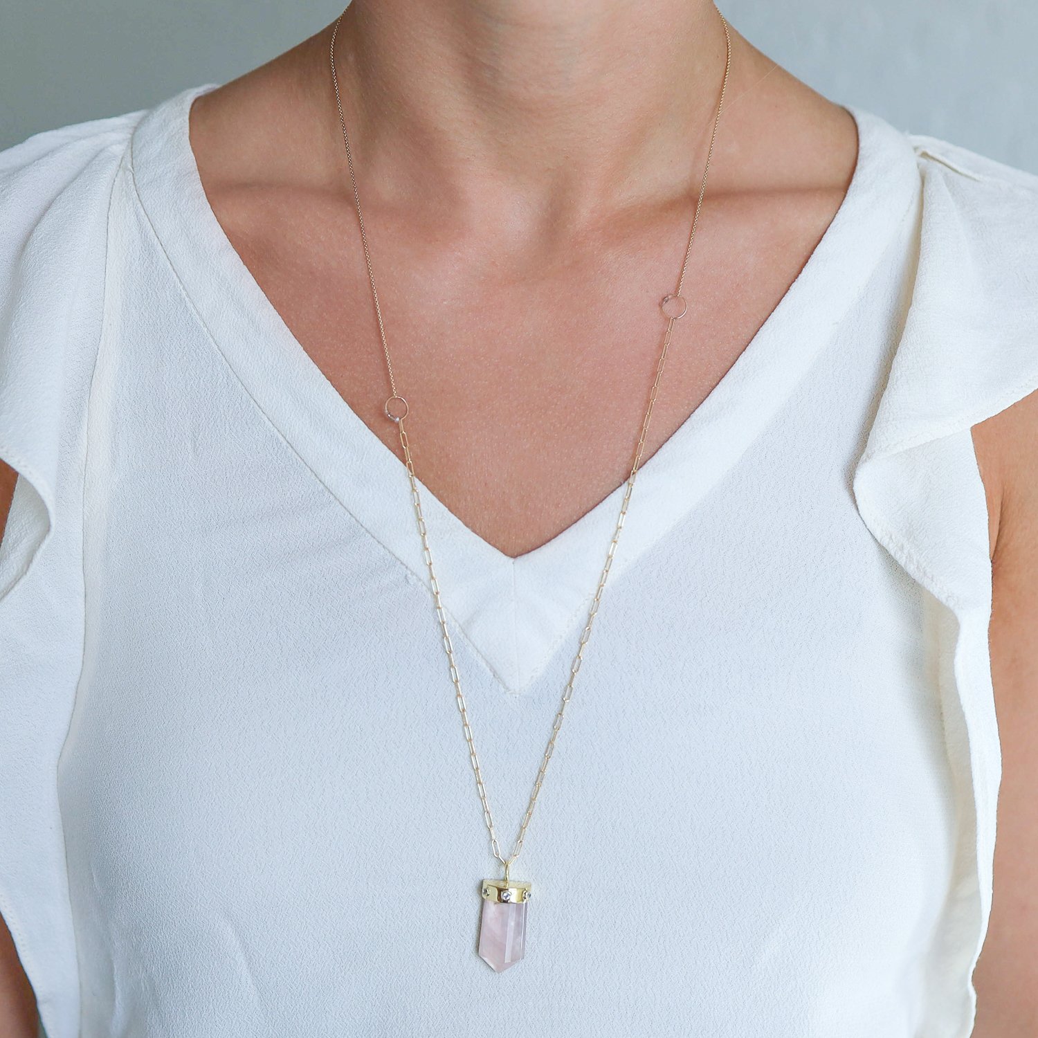 Inspired by the magical color play of the Aurora Borealis, this pendant features a column of crystalline rose quartz, capped by a crown of gold. Set on a long chain for easy layering with other necklaces.