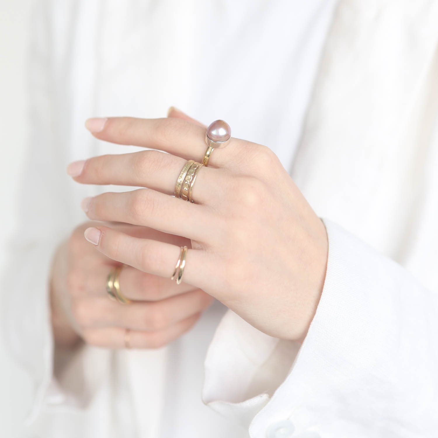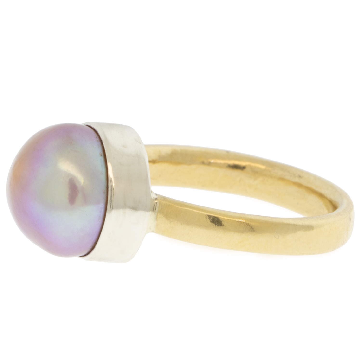 This ring is the perfect cross between elegant and modern, featuring a silver-bezeled luminous pearl on a gold band.