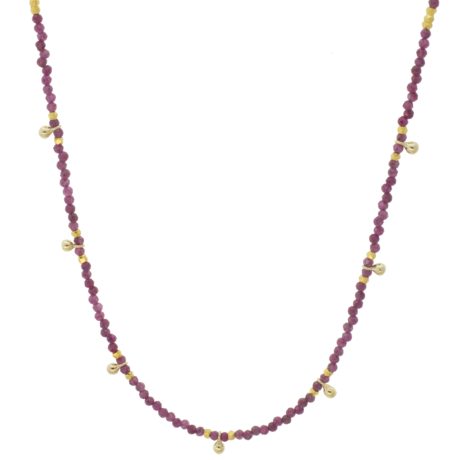 This beaded necklace celebrates the natural beauty of rubies by enhancing the flow of beads with gold fragments. It is the perfect addition to your favorite layers.