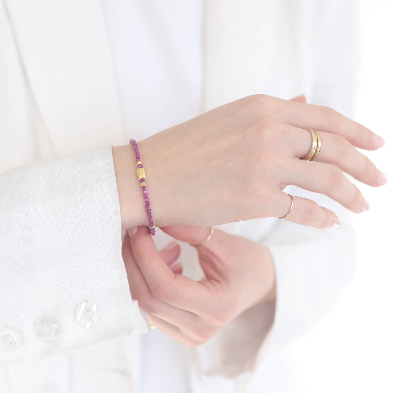 This beaded bracelet celebrates the natural beauty of rubies by enhancing the flow of beads with gold fragments. It is the perfect addition to your favorite layers.