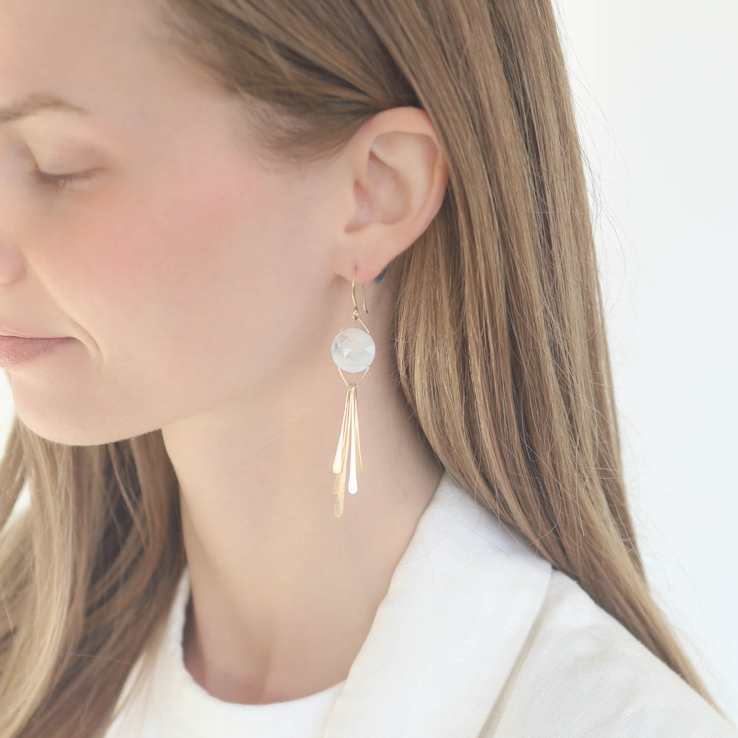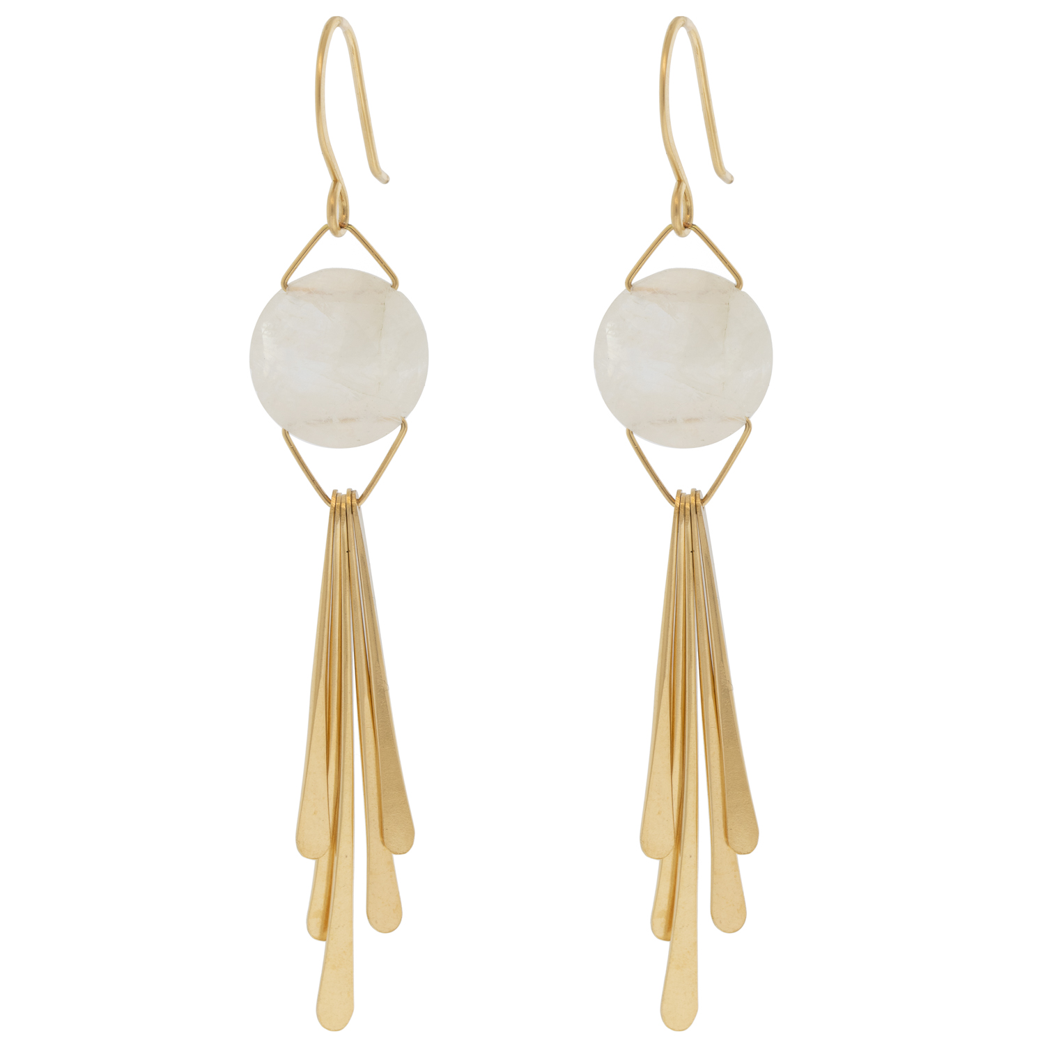 Square-cut moonstones descend into a cluster of fluid, twisting gold bars to form a pair of earrings that are elegant and dynamic.