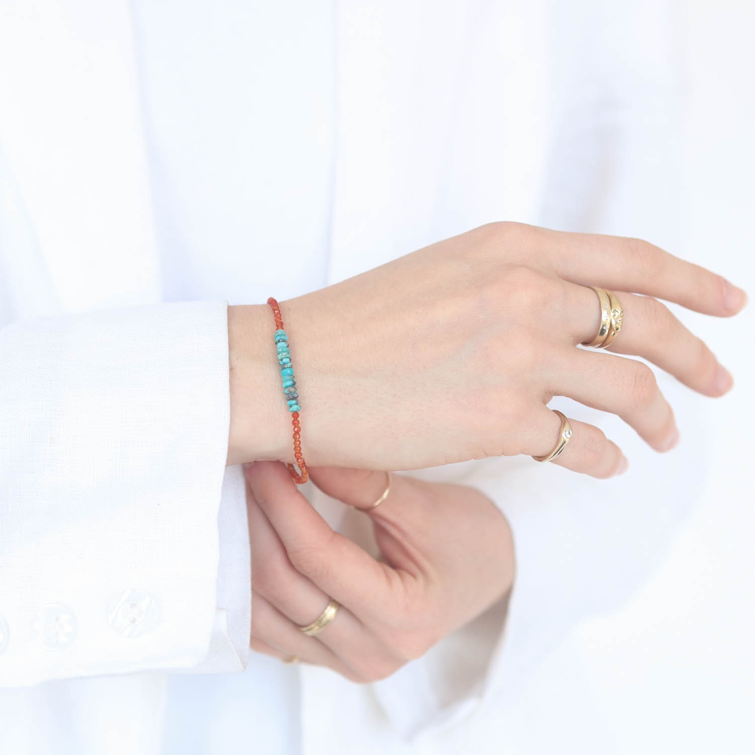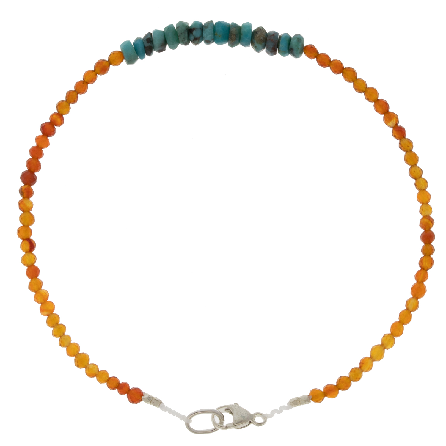 Enhance your favorite layers with this carnelian and turquoise beaded bracelet. Carnelian is known to be the stone of creativity and confidence, while turquoise is thought to protect from negativity and harm and to help promote a sense of peace and tranquility.