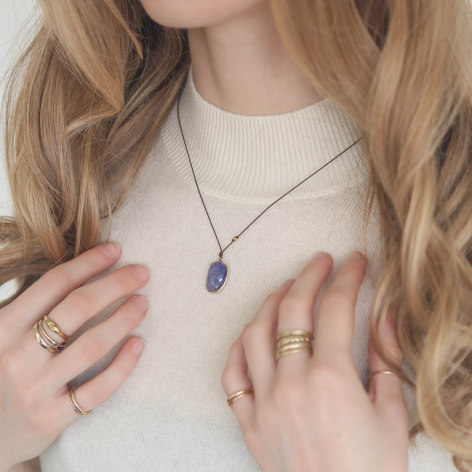 Natural beauty abounds within this tanzanite encased in an ultra-minimal gold bezel. Tanzanite is thought to be a calming and soothing stone, one that encourages communication and problem-solving skills. The stone is accented by a single gold bead, and strung on a durable and versatile nylon cord.