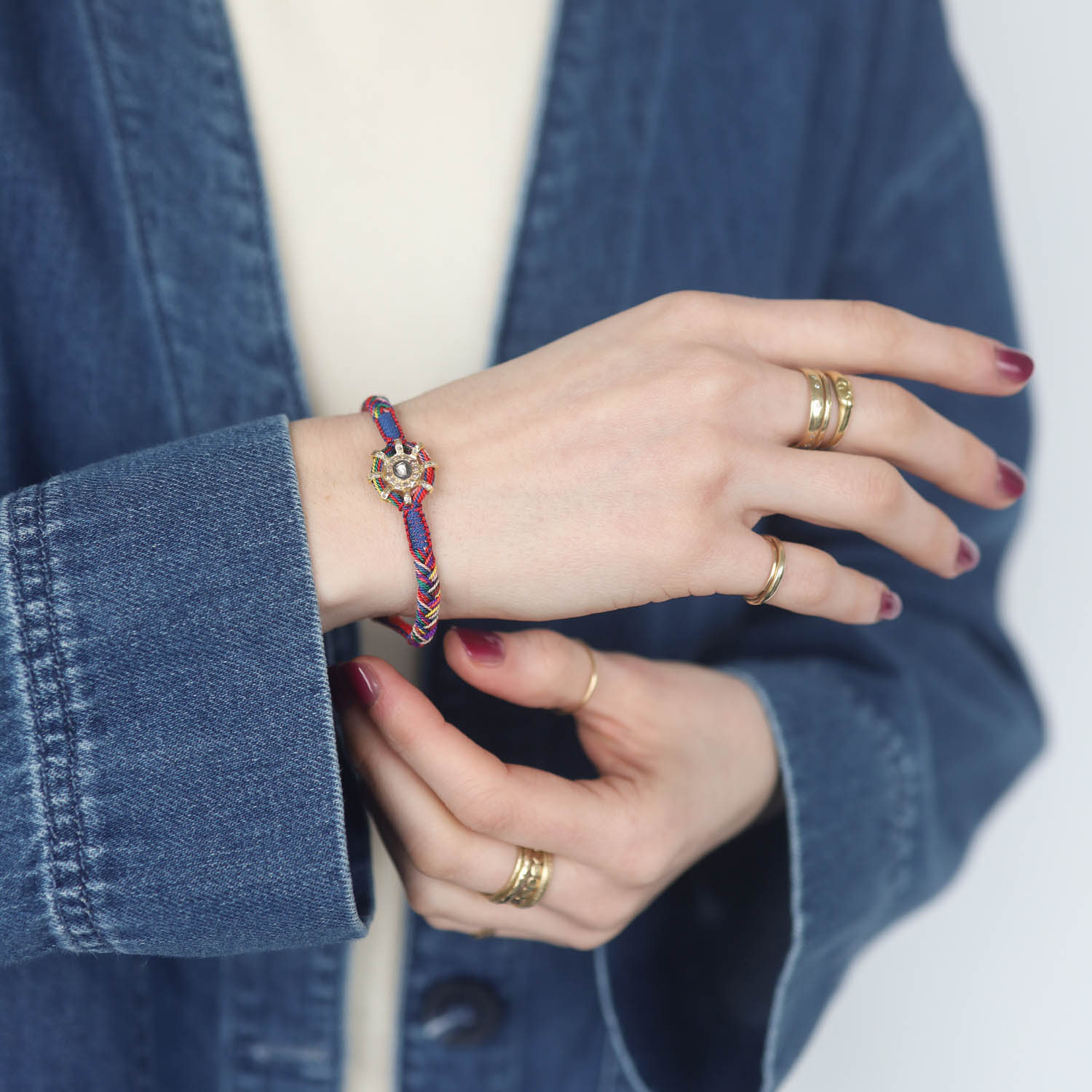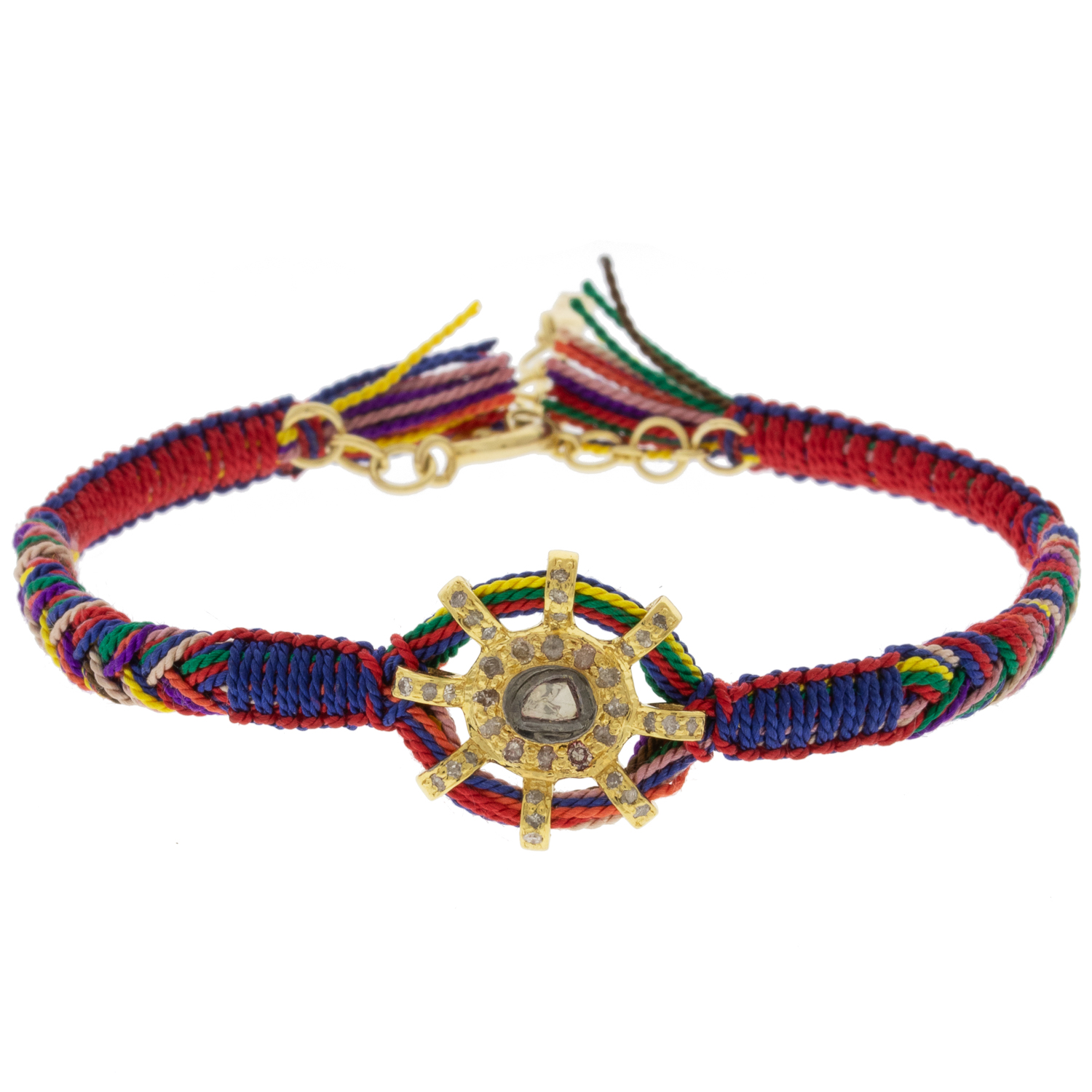 This ornate bracelet is both elegant and playful, complete with colorful macrame straps and a luxurious gold and diamond sun-shaped center. Worn layered or on its own, this bracelet stands out for its dynamic design and stunning textures.