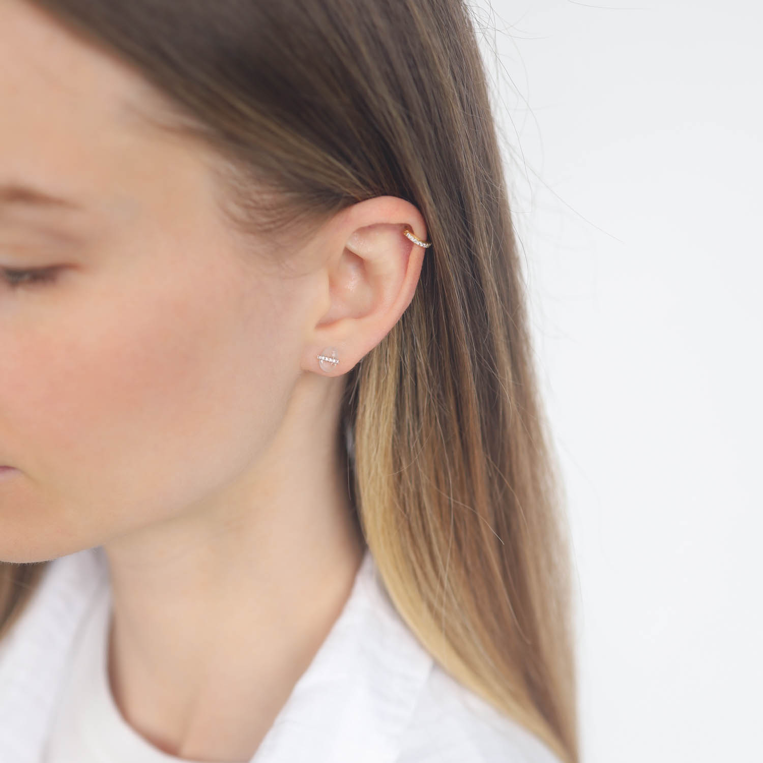 Moonstones wrapped in a diamond lined gold strip form an elegant and striking earring with a modern design. These are the perfect pair to a night out or special event, bringing all the subtle glam you need.