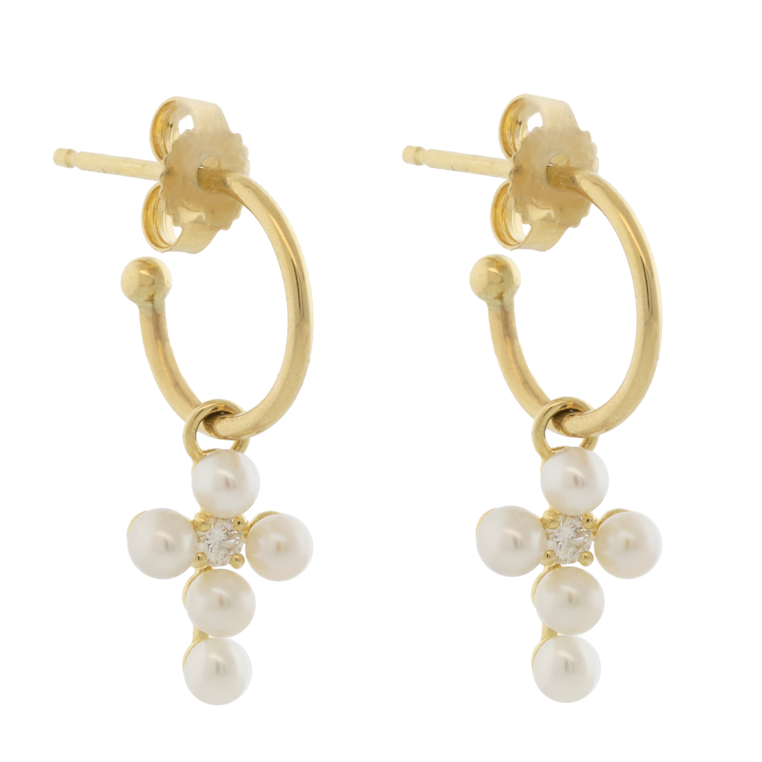 A long-time symbol of faith, these pearl and diamond cross hoops are sweet and elegant, the perfect everyday jewelry.