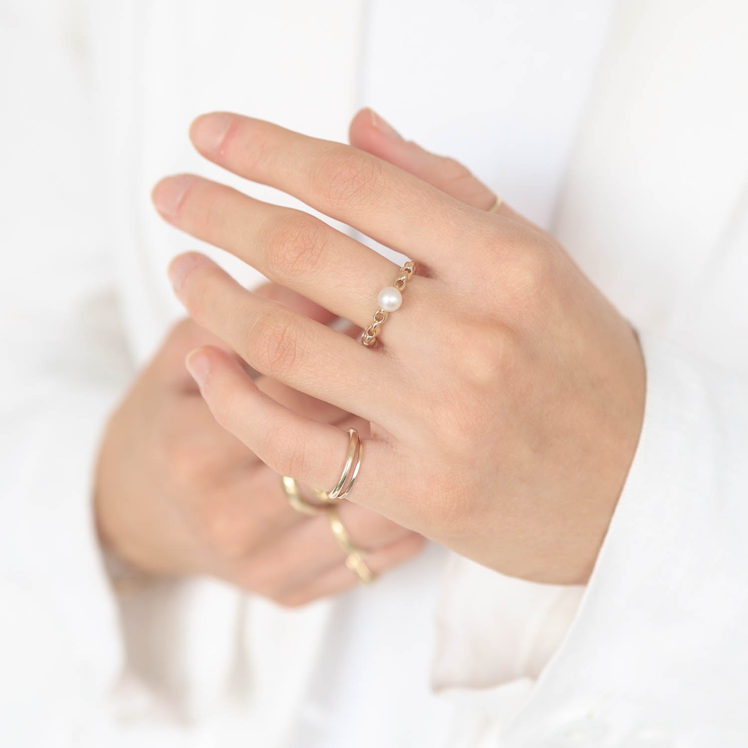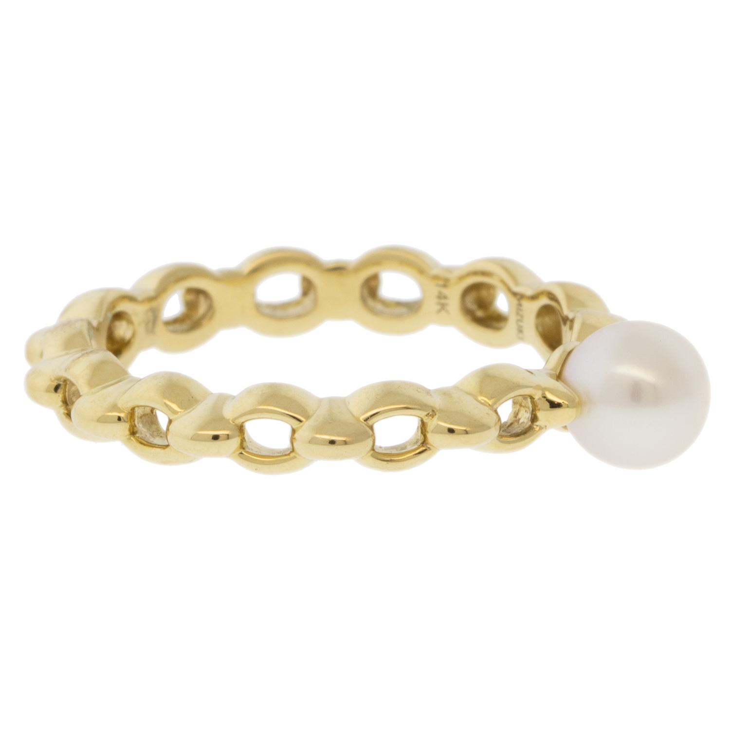 The design of this ring mimics gold links chained together in a luminous halo, finished by an elegant pearl center.