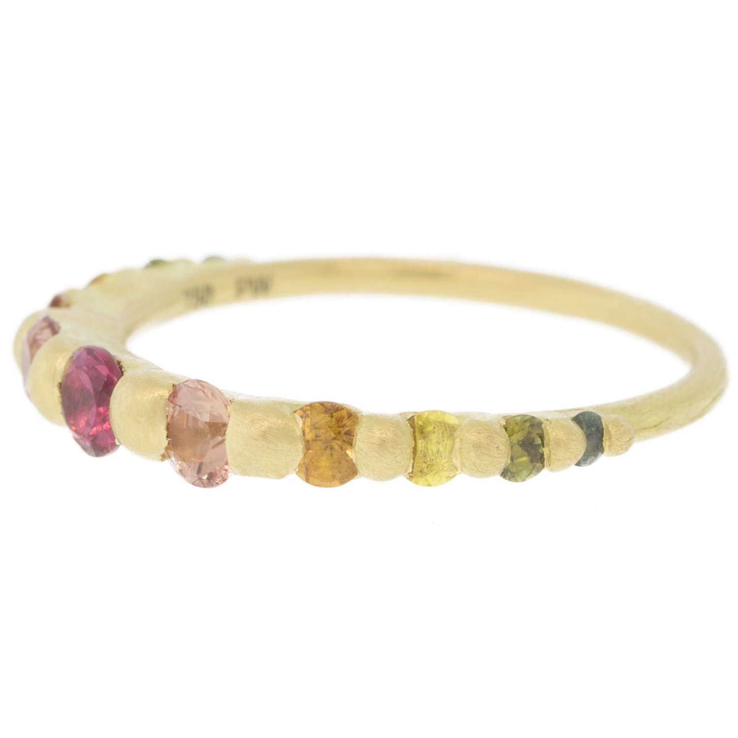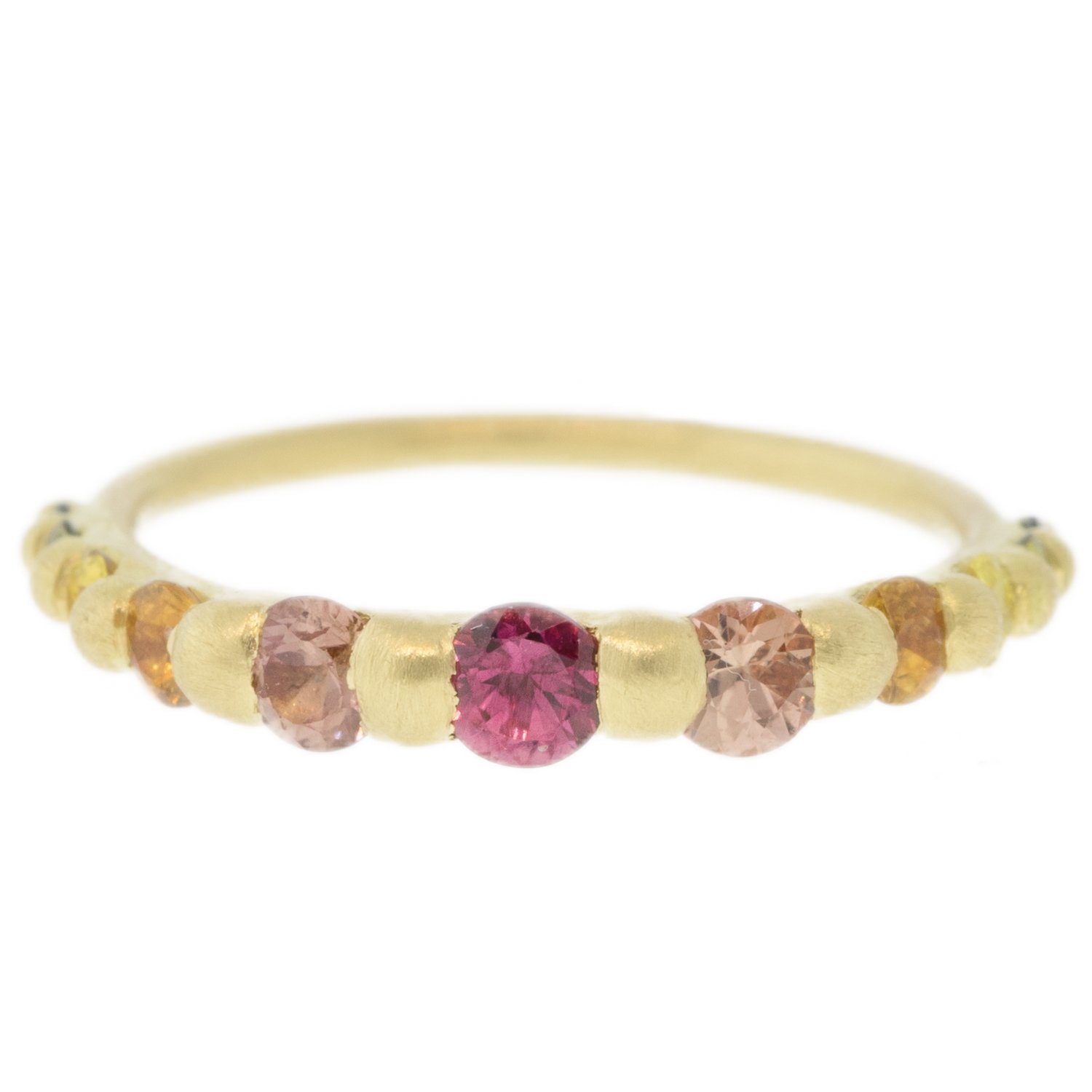 A demi-halo of vibrant sapphires in rainbow and blush-colored hues encircles this enchanting granule-dotted band. Twinkling with light and color, this ring is sure to steal the spotlight.