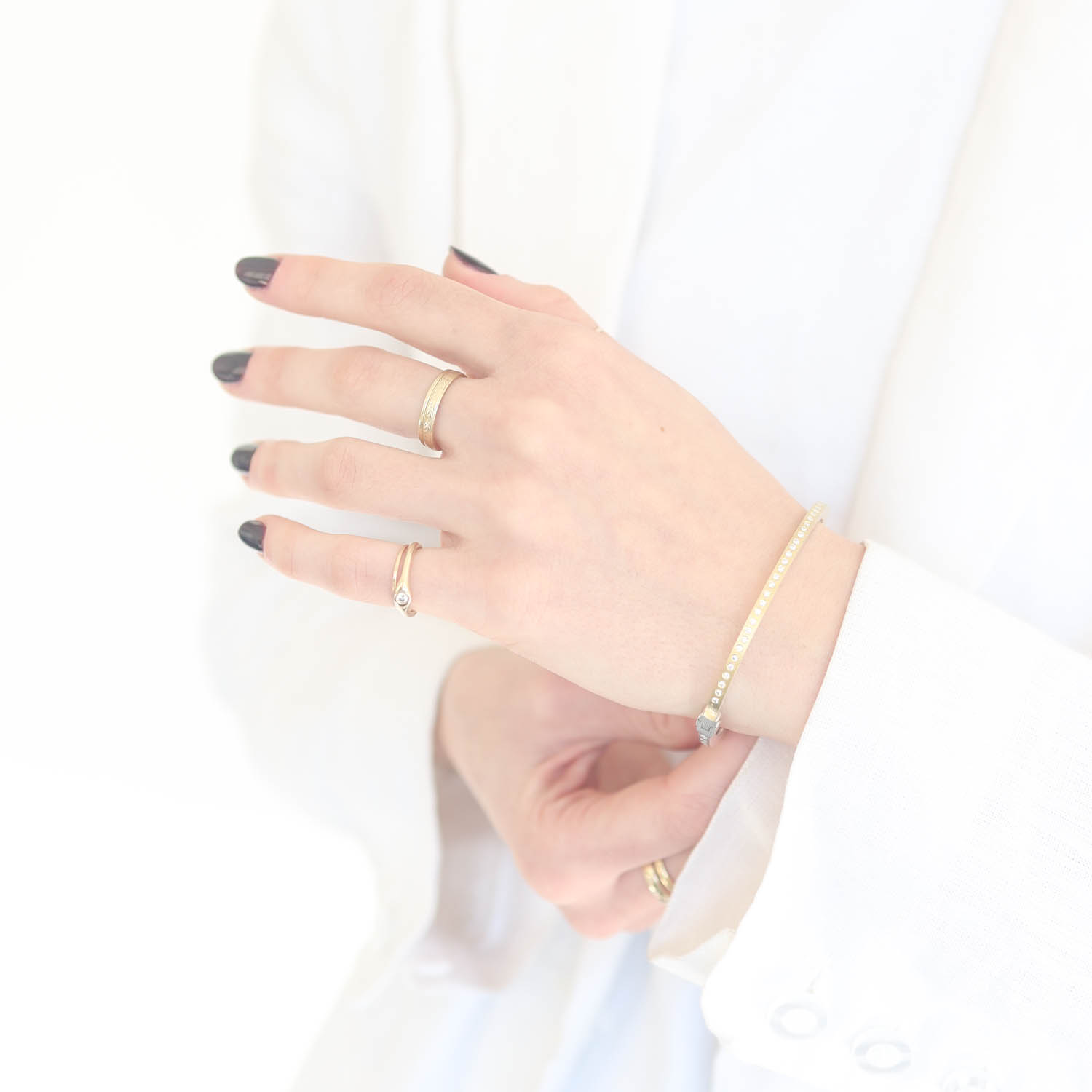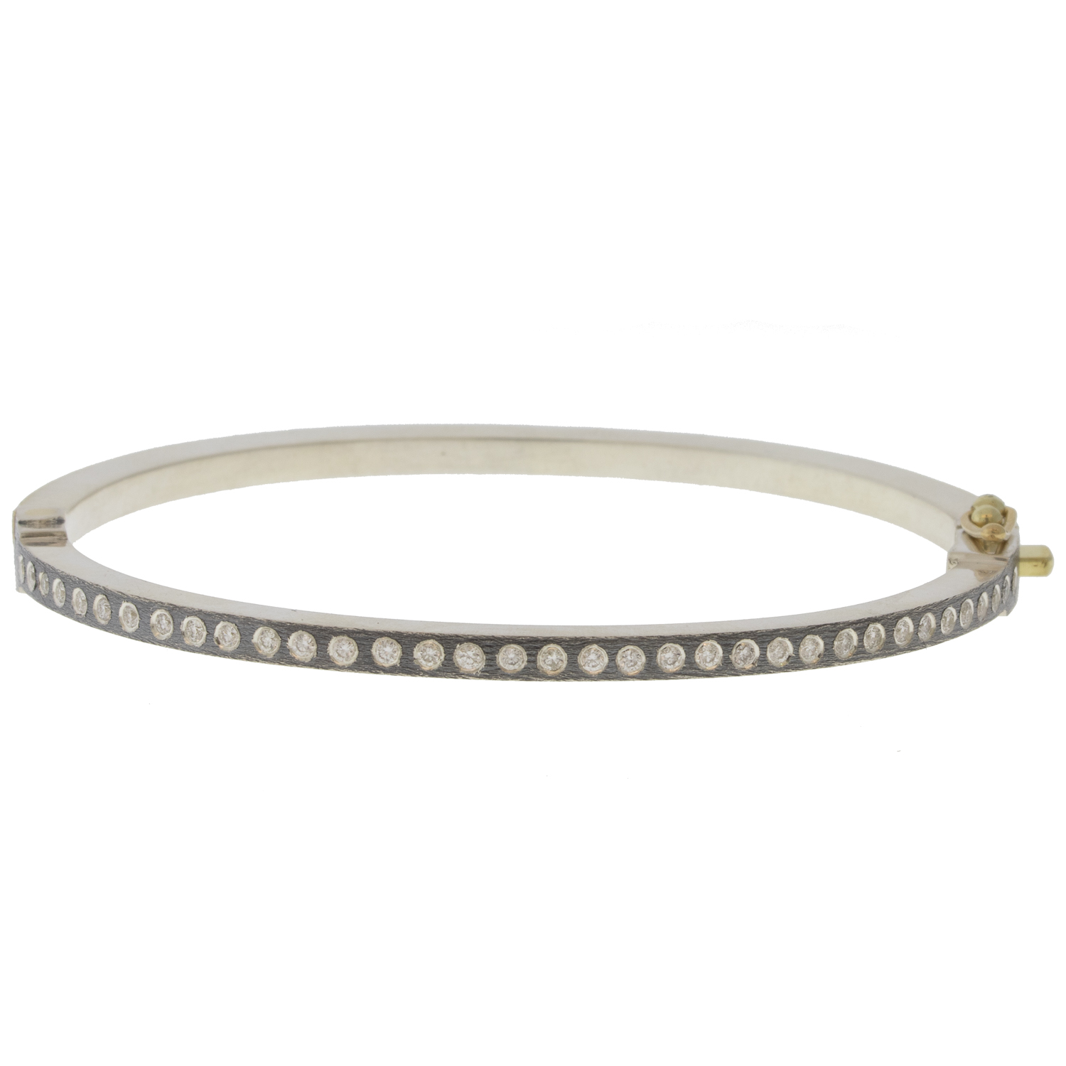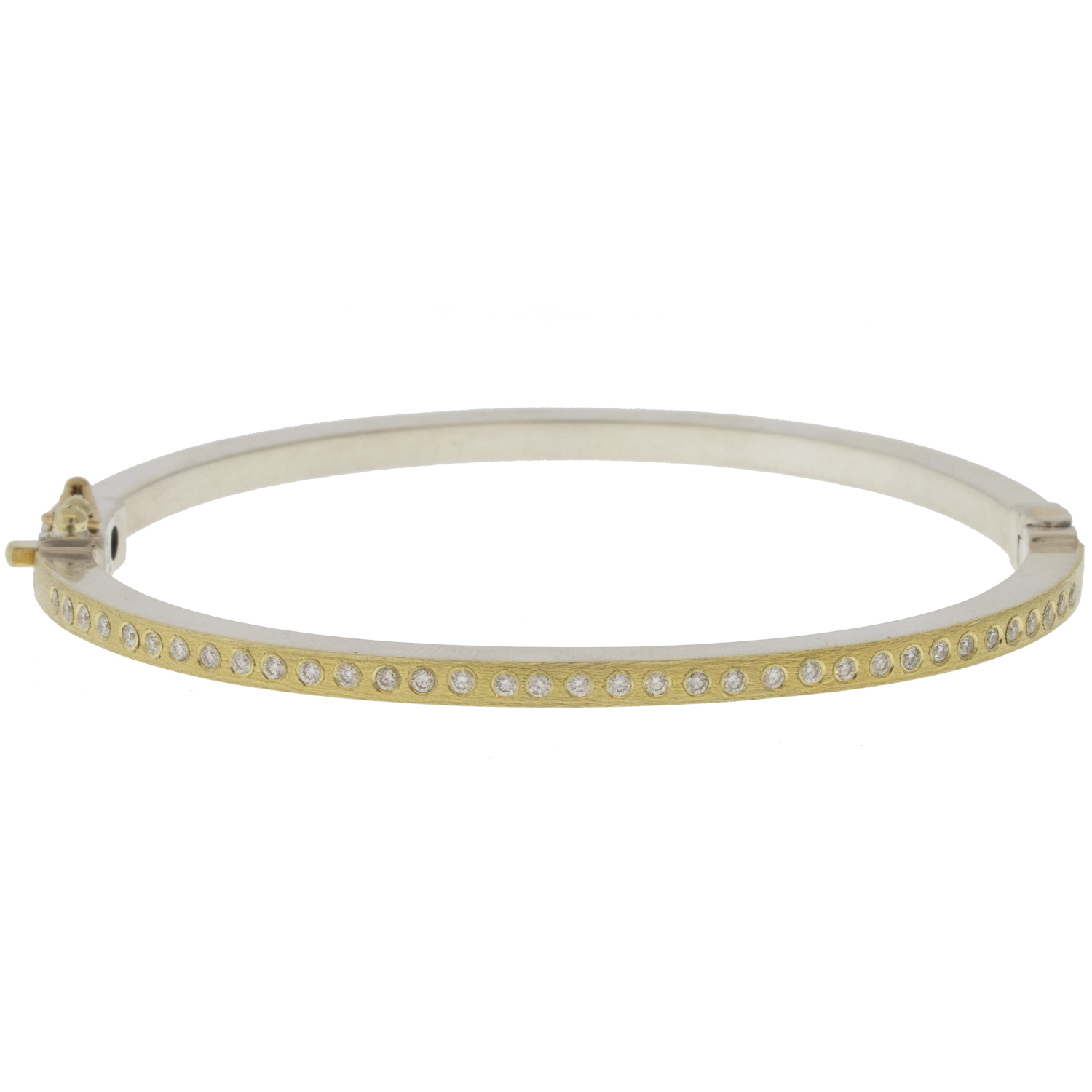 Subtle cross-hatching enlivens the surface, creating a matte luster that completes this bracelet’s industrial, effortlessly cool vibe. Its slim profile is perfect for layering or wearing alone for a glimmer of gold and diamond sparkle. Ultra versatile, this bracelet features diamonds on both sides so that it can be worn with either the gold or silver side showing.