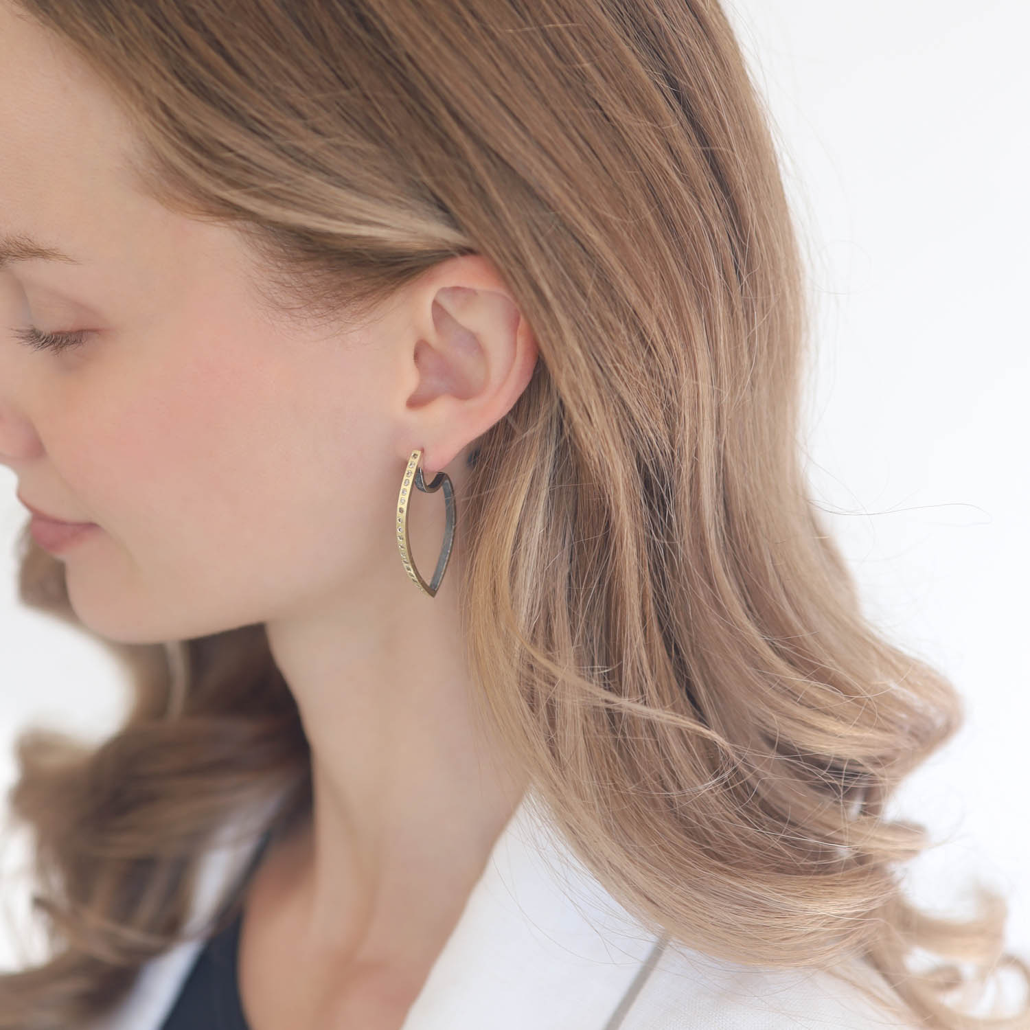 The Celine earrings feature a line of twinkling champagne diamonds, a satiny surface full of lustrous texture, and an eye-catching shape that uniquely hugs the ear.