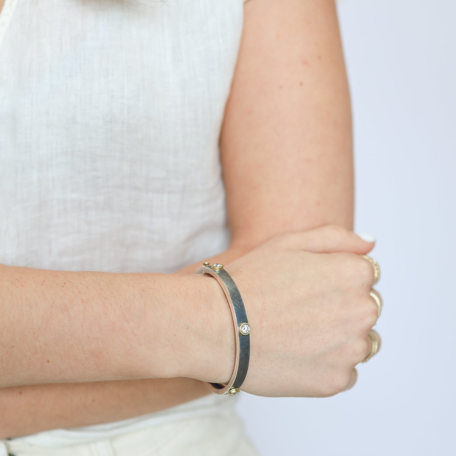t’s not hard to see why these have become the most sought-after bracelets in our store… Rene’s design effortlessly balances strong structural lines with a soft, satiny finish and three perfectly spaced diamonds. Subtle cross-hatching enlivens the surface, creating a matte luster that completes this bracelet’s industrial, effortlessly cool vibe.