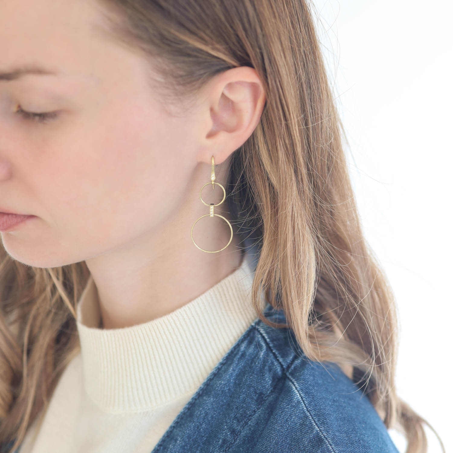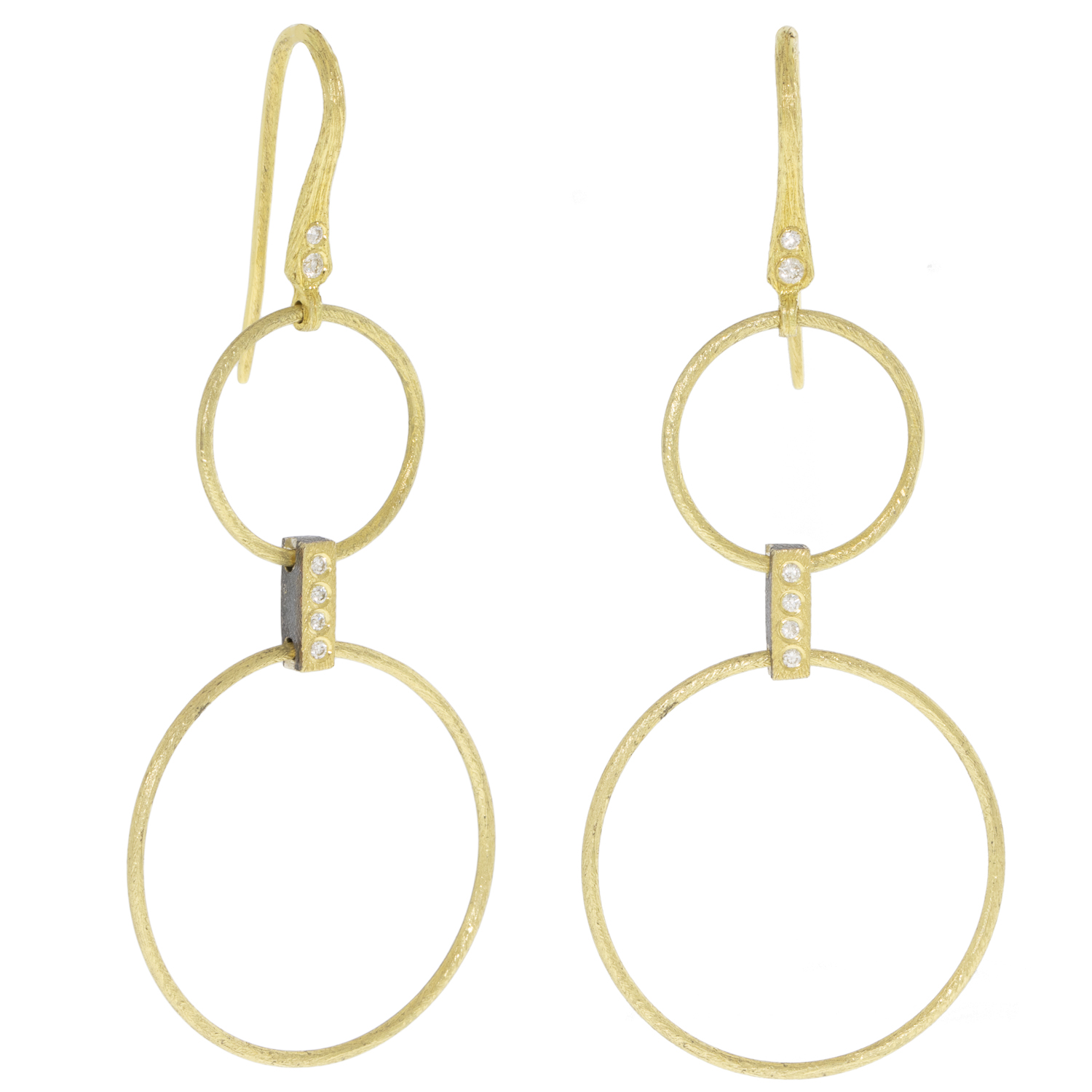 Two golden rings cascade down from a sleek earwire, linked together by a sleek, diamond-dotted bar.