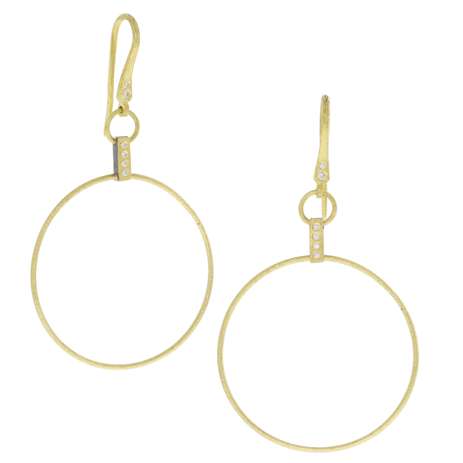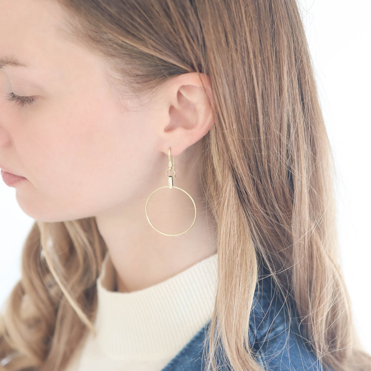 Two golden rings cascade down from a sleek earwire, linked together by a sleek, diamond-dotted bar.