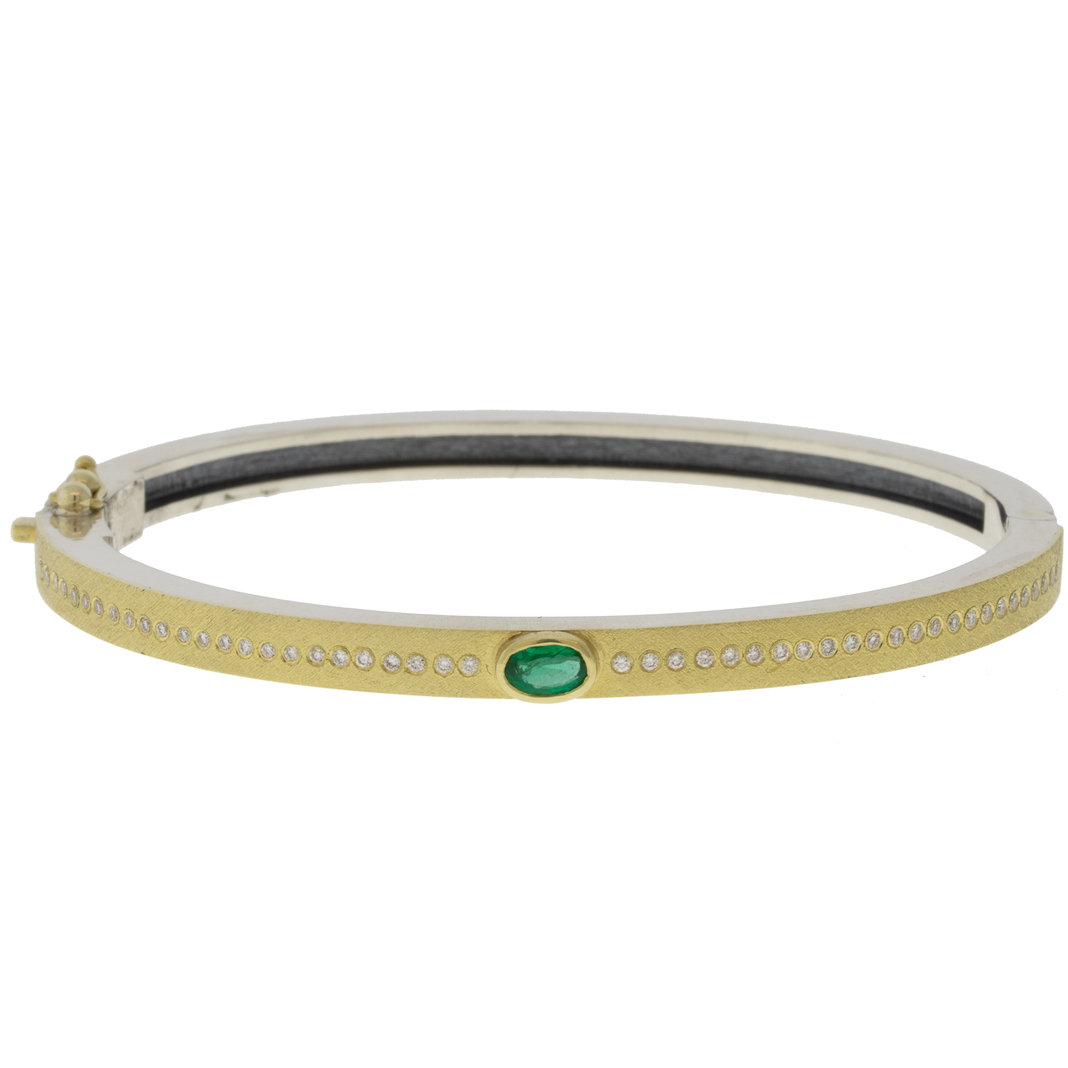 Rene Escobar:JUNIA PLUS 4MM YG hinged bangle featuring an 18k YG push button style clasp and a solid 18k YG top sheet and bezel set with OV cut with 0.48CT of EME quantity