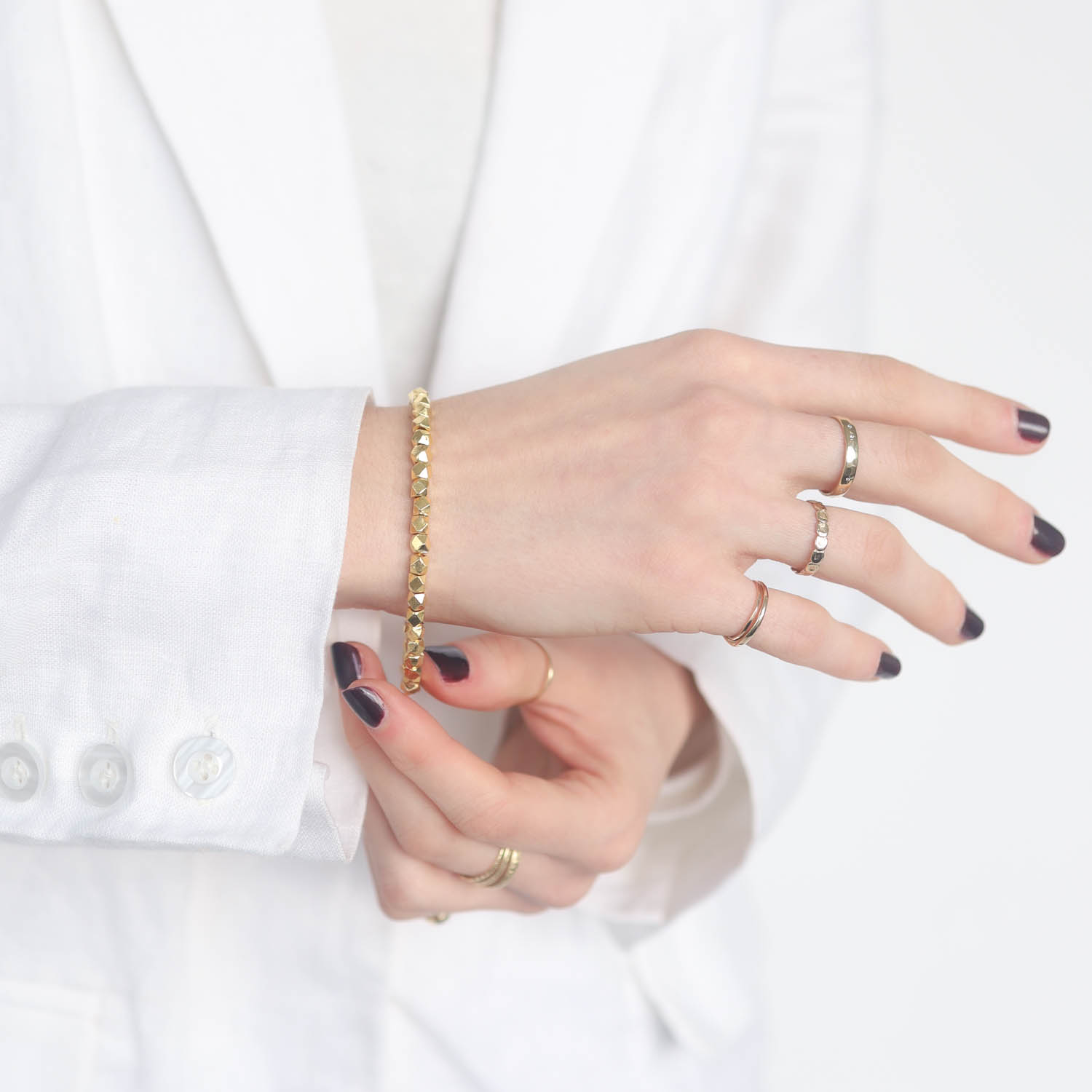 Faceted gold beads form a simple bracelet that is the perfect versatile layering piece.