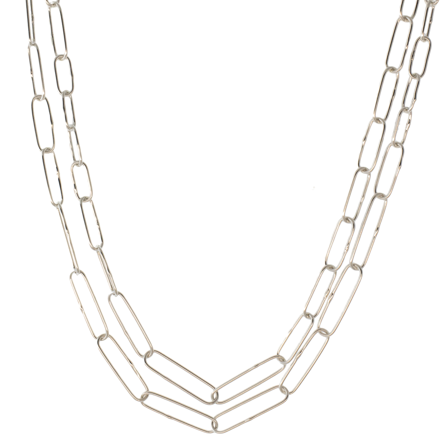 This chain celebrates the unity of modernity and classic silhouettes, formed by delicately hammer-textured paperclip links in a silver matte luster.