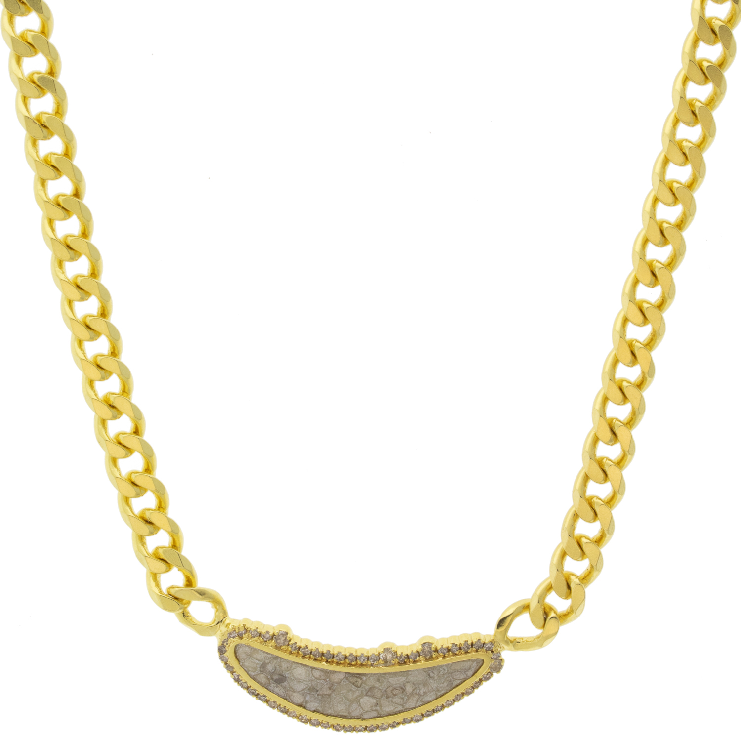 Shana Gulati is a shining star in the world of up-cycling. Initially discarded diamonds are reborn into something completely unique in her stunning resin mosaics. The union between raw diamonds and resin is the very fabrication of what gives these remarkable designs their distinctive sparkle. This particular design from Shana Gulati showcases this technique in a crescent pendant, framed by champagne diamonds on a thick chain.