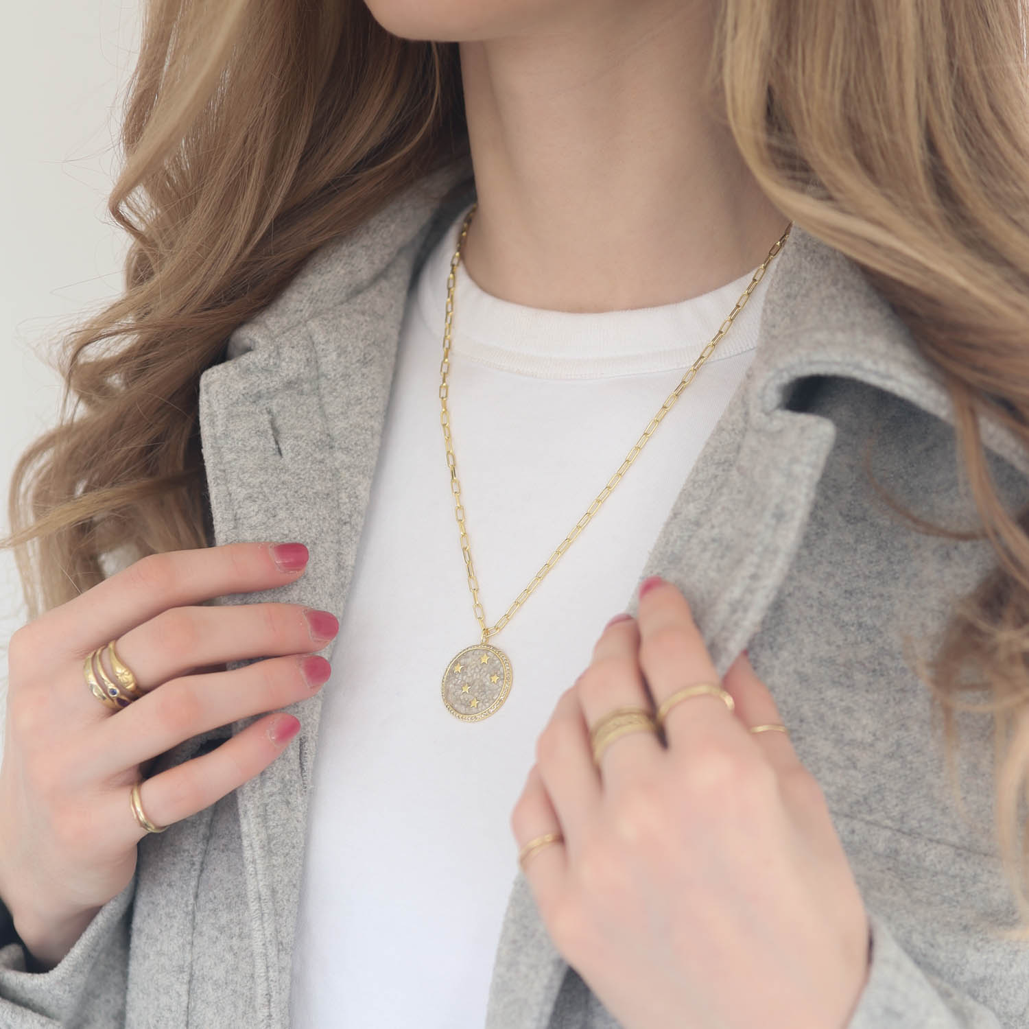 Shana Gulati is a shining star in the world of up-cycling. Initially discarded diamonds are reborn into something completely unique in her stunning resin mosaics. The union between raw diamonds and resin is the very fabrication of what gives these remarkable designs their distinctive sparkle. This particular design from Shana Gulati showcases this technique in a round pendant, overlain by petite golden stars, and framed by champagne diamonds on a paperclip chain.