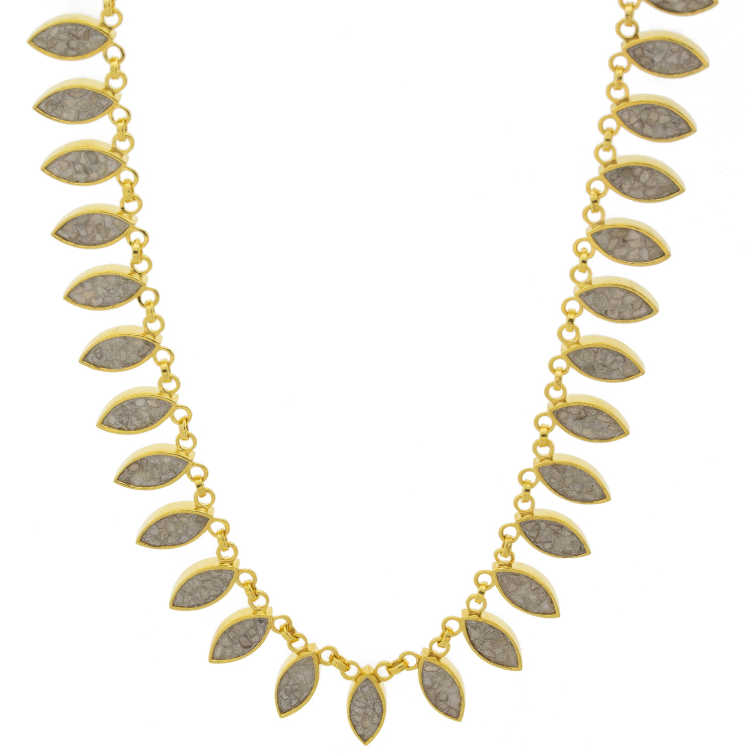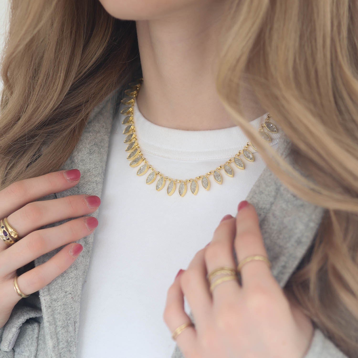 Shana Gulati is a shining star in the world of up-cycling. Initially discarded diamonds are reborn into something completely unique in her stunning resin mosaics. The union between raw diamonds and resin is the very fabrication of what gives these remarkable designs their distinctive sparkle. This particular design from Shana Gulati showcases this technique in small, marquise charms on a gold chain.