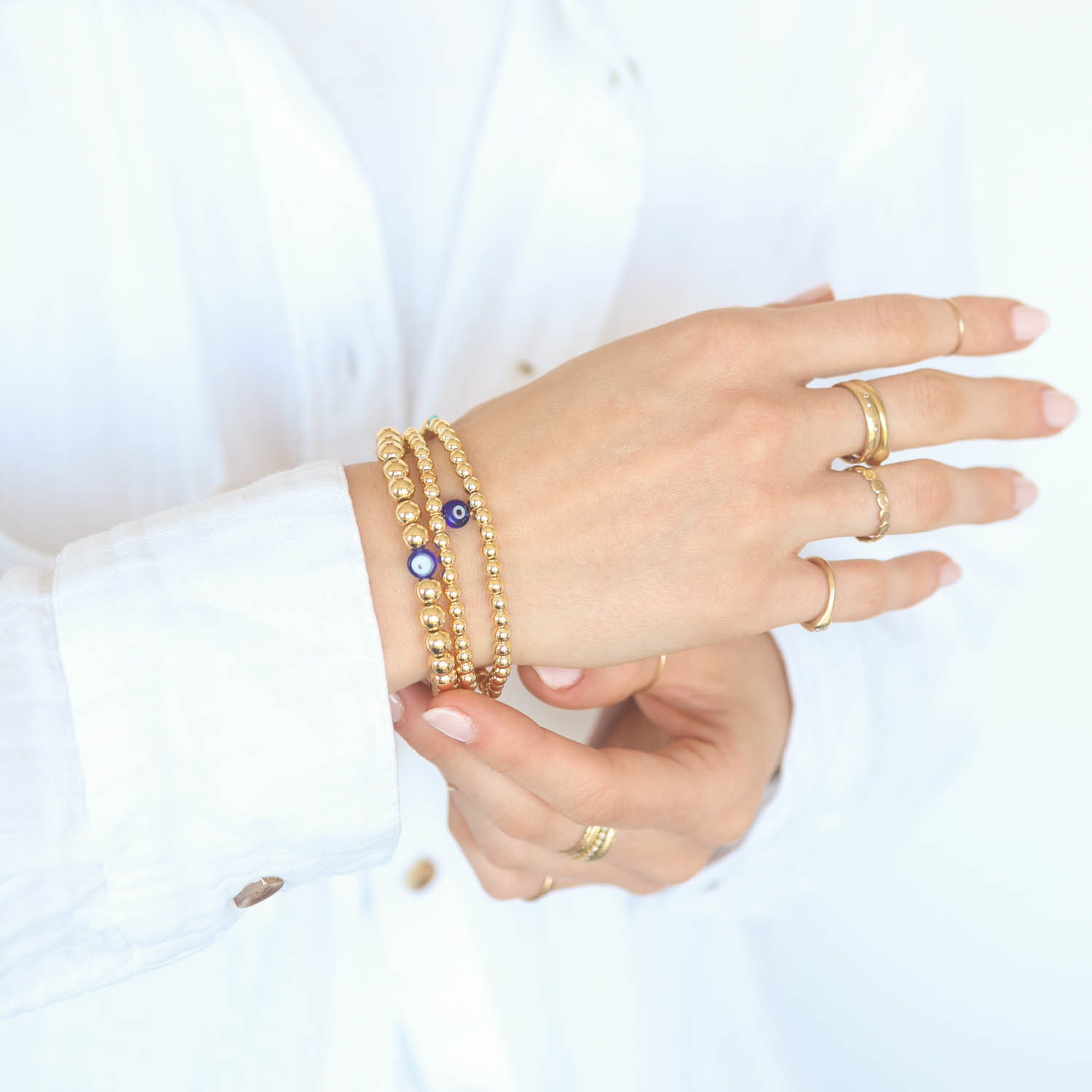 Round gold beads are accented by intermittent blue evil eye motifs which have been worn as a talisman to ward off evil.