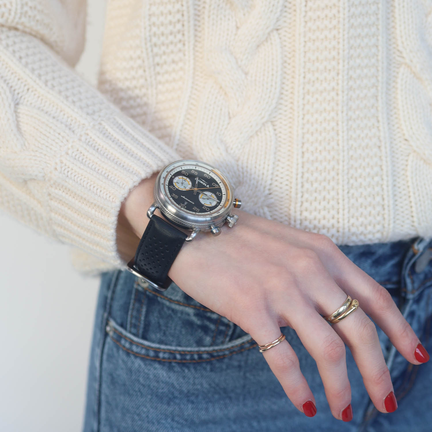 This heirloom-ready, black watch by Shinola is serving everything modern and sleek, garnished by refined, timeless details. The black dial features contrasting bright yellow details, sleek numerals, and modern hands. The sapphire crystal serves as a protective shield, preserving the watch from scratches and other mishaps over the years.