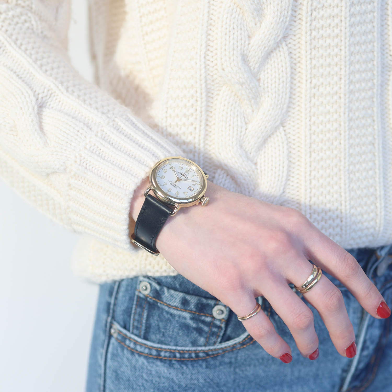 This heirloom-ready watch by Shinola is serving everything modern and sleek, garnished by refined, timeless details. Built to last and named accordingly, every detail of the Runwell was designed with an obsessive focus to ensure the highest possible quality. This cream dial is refreshingly punctuated by shiny golden numerals and hands. The double-domed sapphire crystal serves as a protective shield, preserving the watch from scratches and other mishaps over the years.